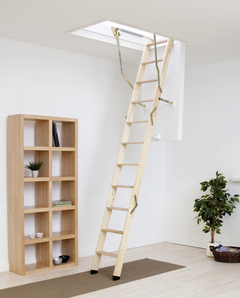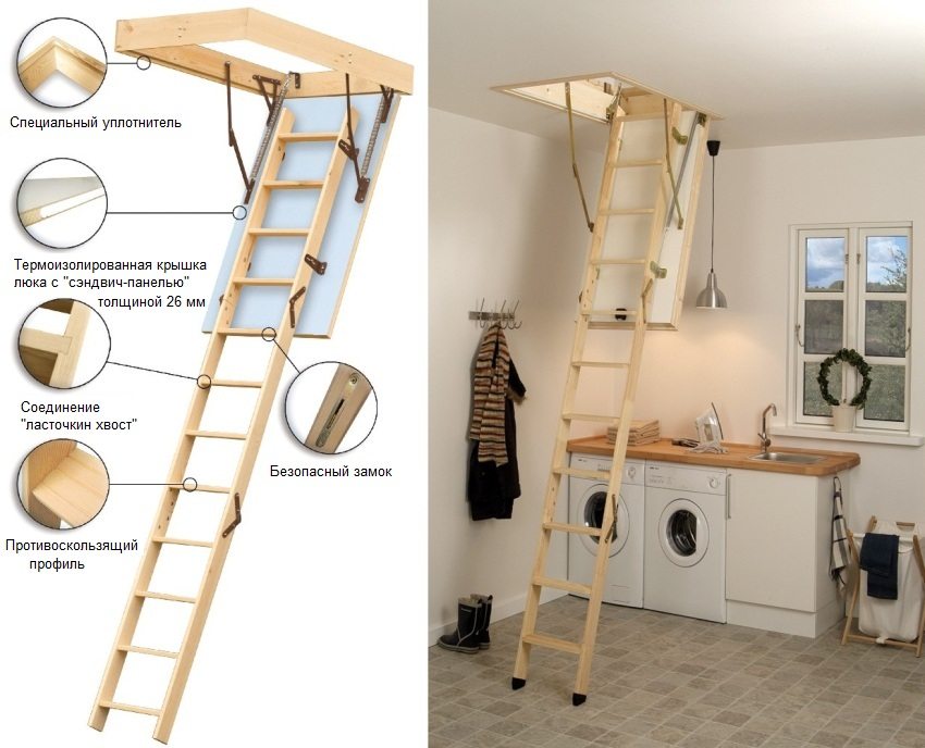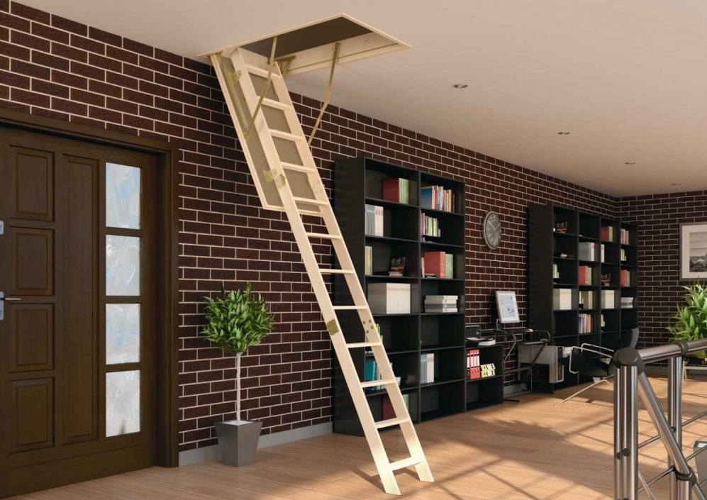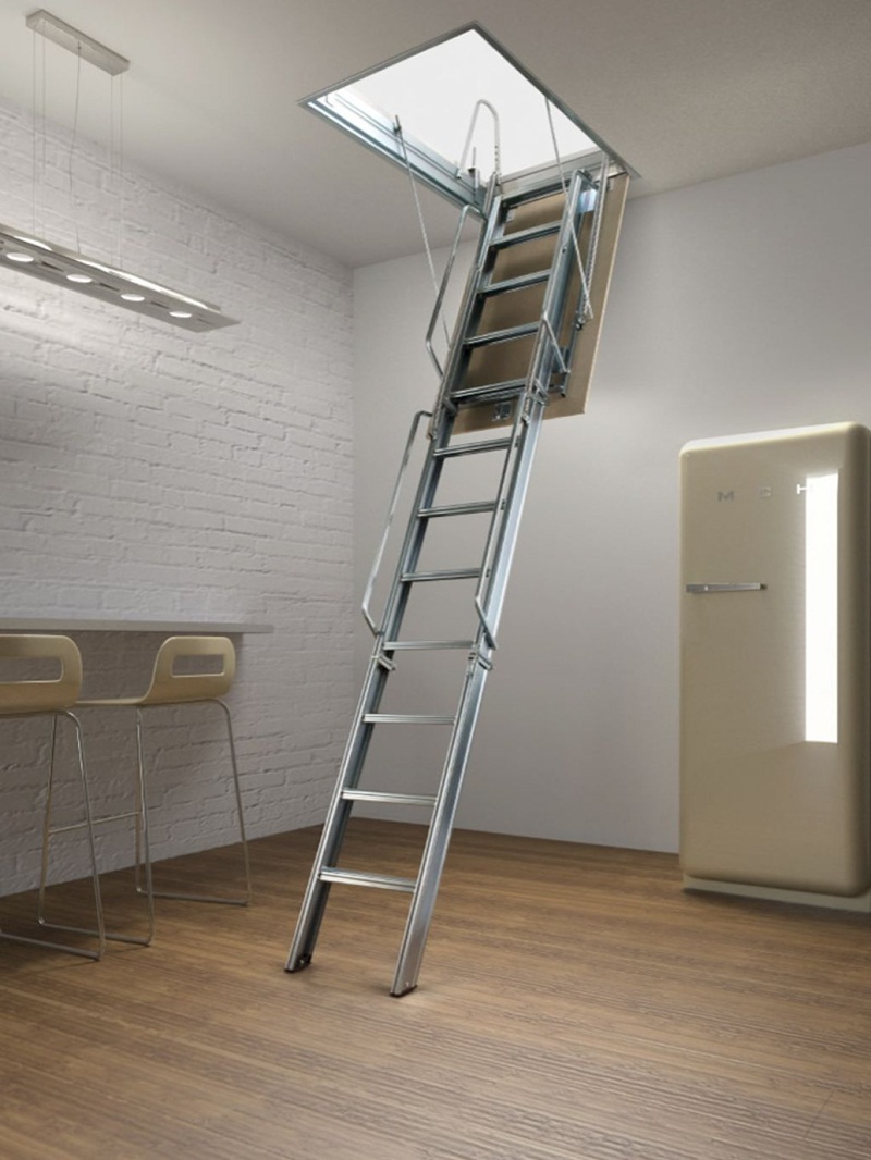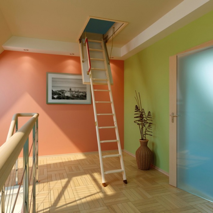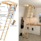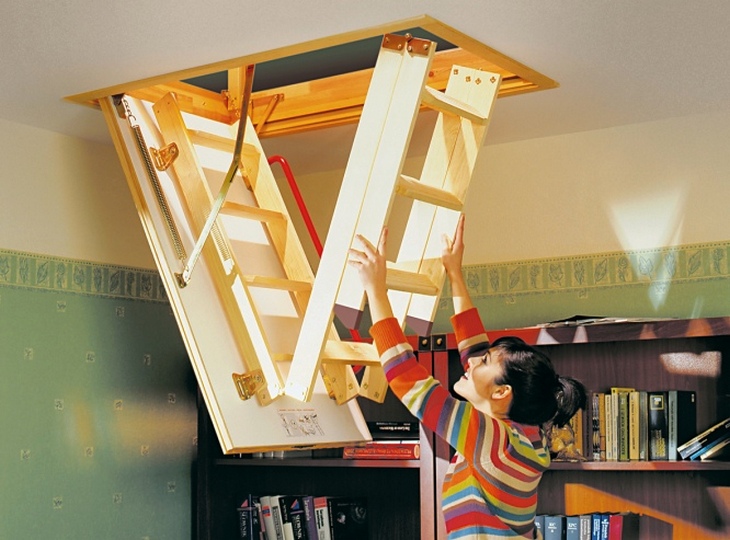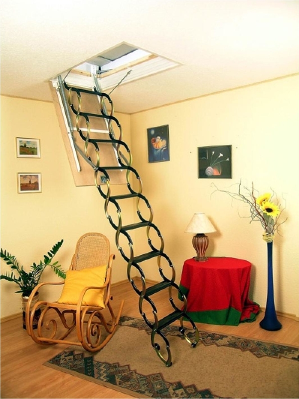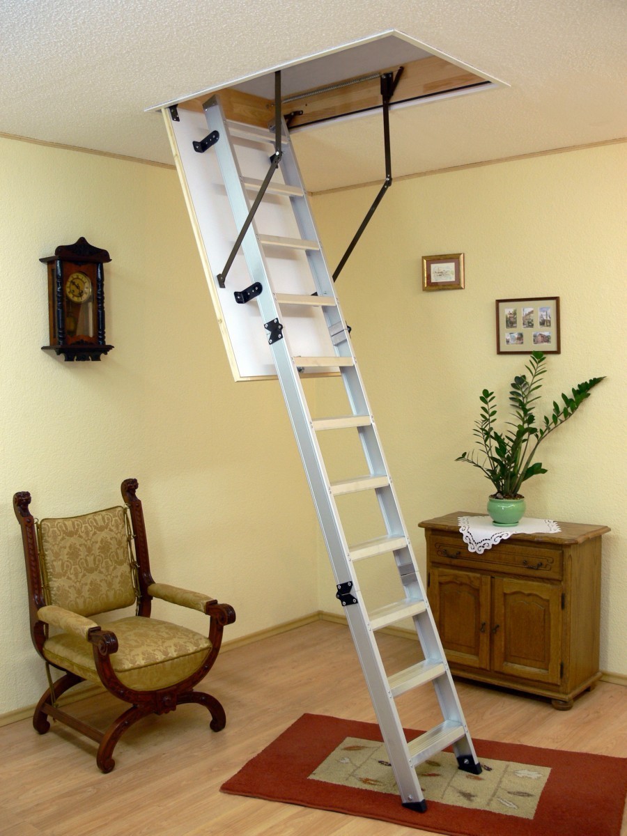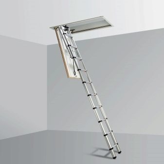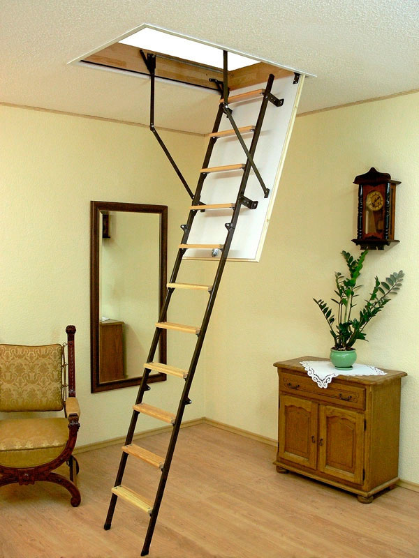 Klapp- oder Schiebedachtreppen sind heute sehr gefragt. Die Einzigartigkeit dieses Designs liegt darin, dass es komplett hinter der Dachbodenluke versteckt ist und sich oben befindet. Meist ist es eine dreiteilige Leiter, die jeweils durch ein spezielles Befestigungselement verbunden ist. Dies ermöglicht das Stapeln von Abschnitt eins zu eins, nicht Akkordeon wie in der ersten Ausführungsform.