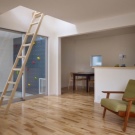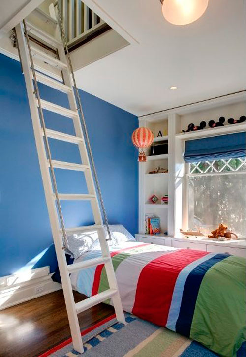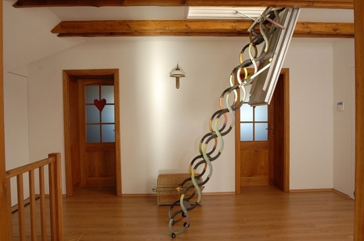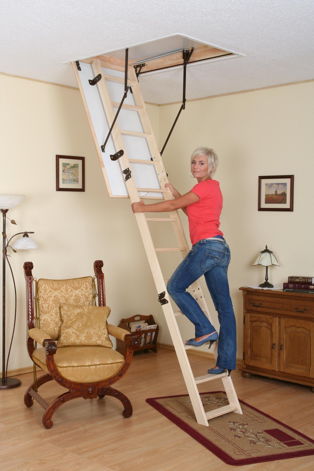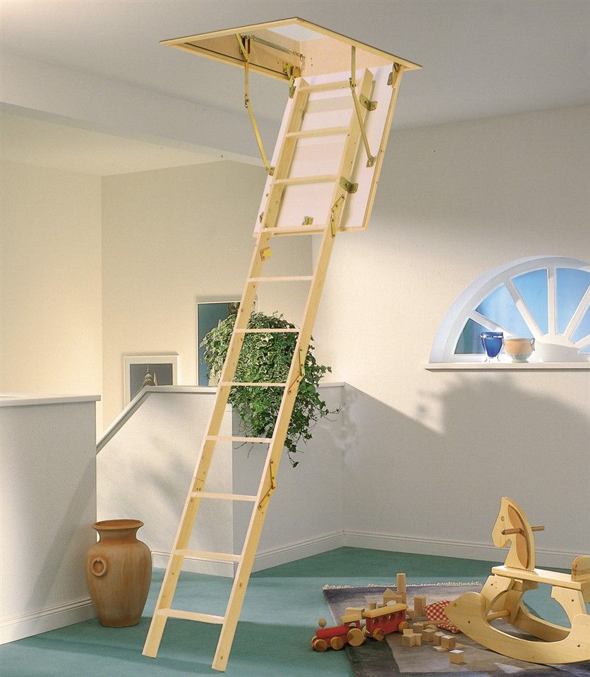 Die klassische dreiteilige Holzleiter mit der Luke sieht sehr winzig und sogar sanft aus. Aber es ist absolut stabil, langlebig und langlebig.