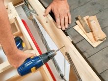 - Zwei kurze Holzbalken, deren Länge der Breite der Deckenöffnung entspricht, sollten mit Schrauben am oberen und unteren Ende der dahinter liegenden Treppe befestigt werden.