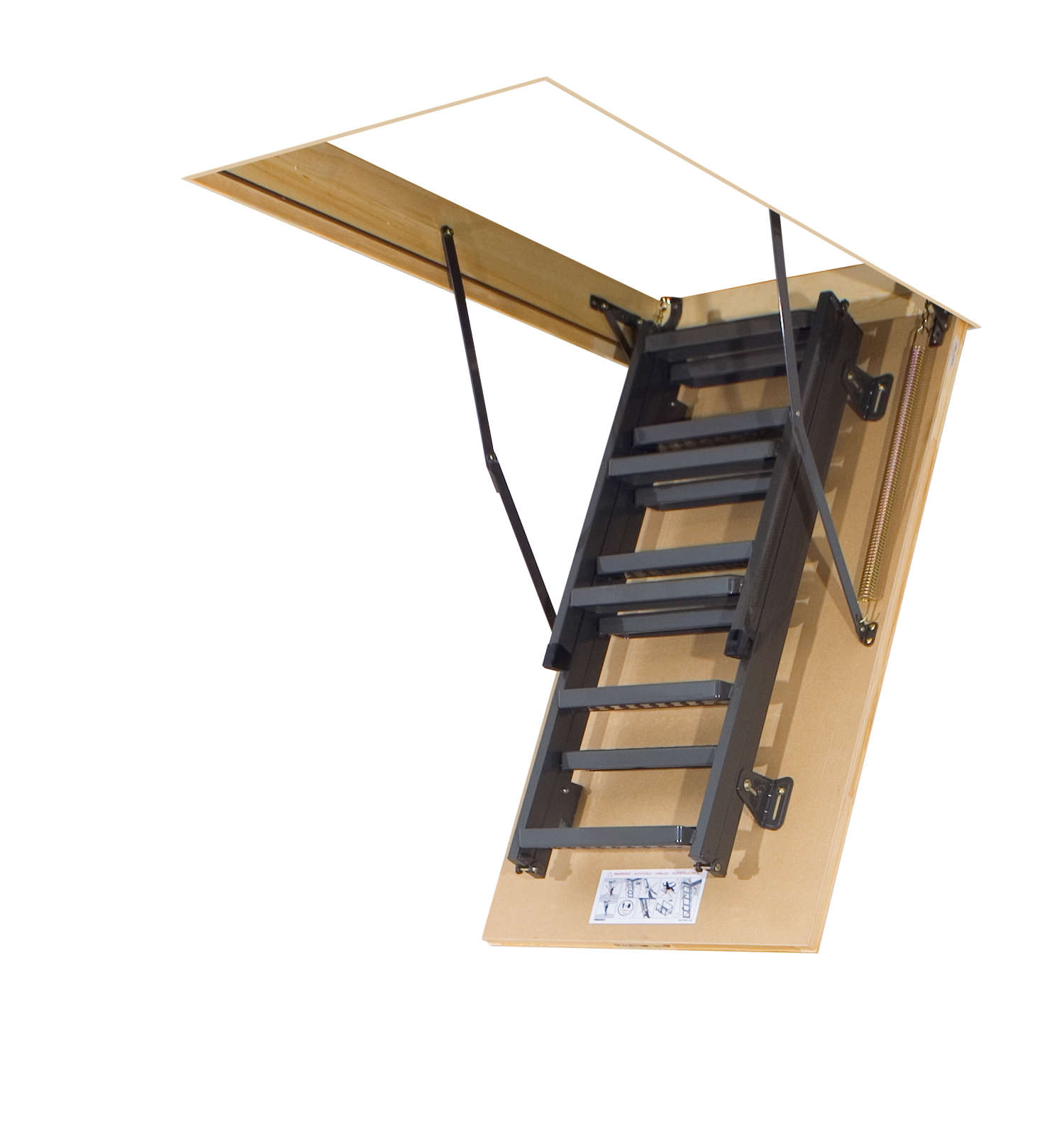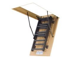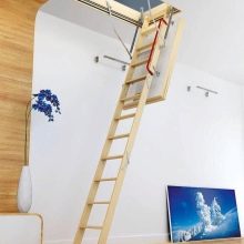 - maximale Haltbarkeit und Festigkeit der Struktur. Dank Metallführungen und Holzstufen steht es im aufgeklappten Zustand fest auf dem Boden und lässt sich leicht zusammenklappen, indem es sich am Deckel der Dachbodenluke festmacht;