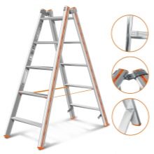 - Falt- und Faltoptionen werden meistens aus Holz hergestellt. Obwohl es Metallmodelle gibt. Die hölzerne Klappleiter gibt angenehmere Tastempfindungen. Der Baum selbst ist ziemlich warm, so dass Sie das Design auch ohne Schuhe verwenden können.