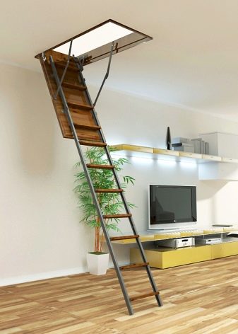 Kombiniertes Klappmodell sieht streng, aber prägnant aus. Metallführer übernehmen die Hauptlast. Holzstufen machen diese Konstruktion umweltfreundlich und ermöglichen es, die Treppe auch barfuß zu erklimmen.