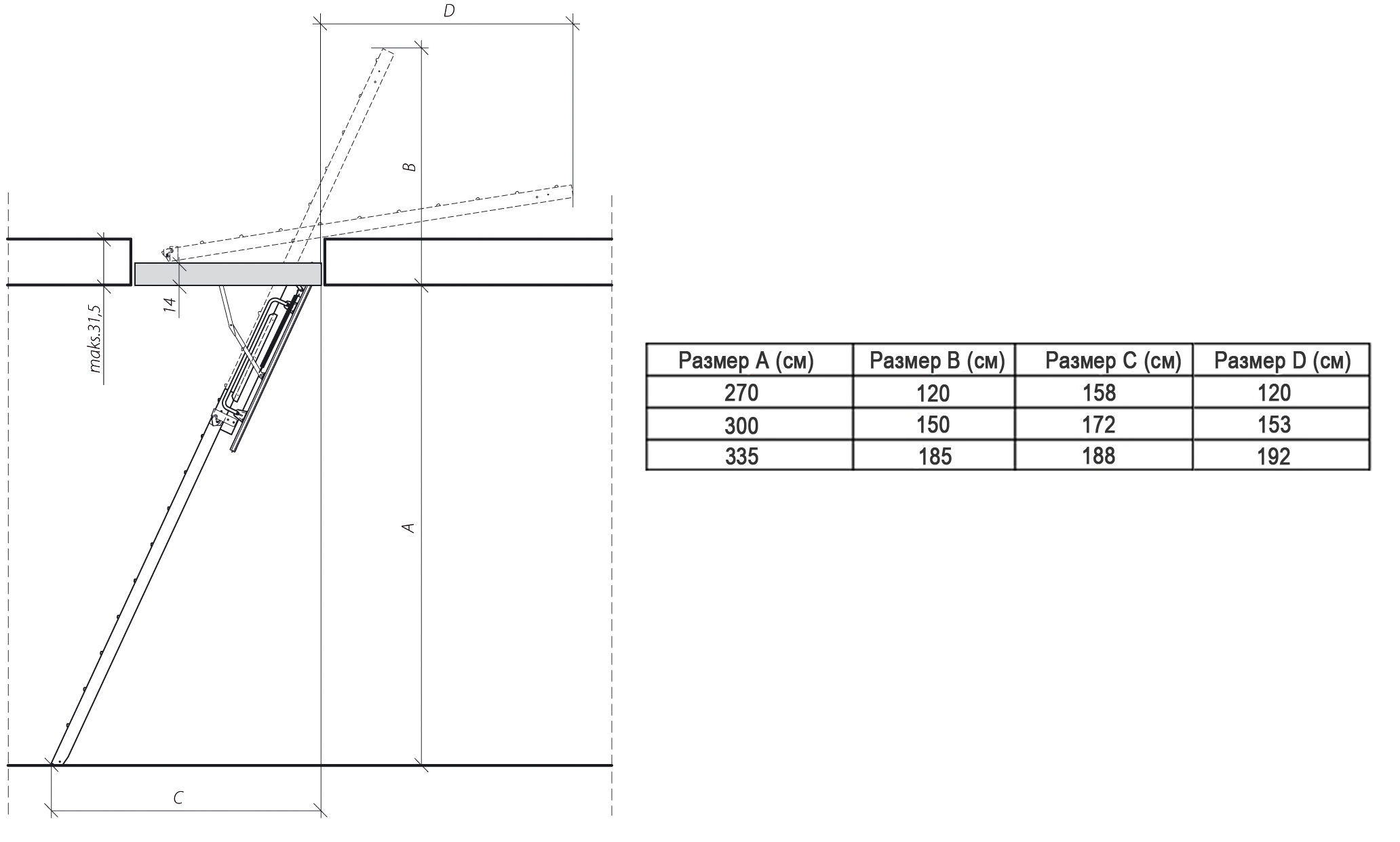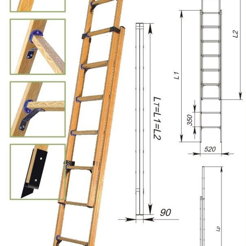 - Die maximale Länge der Klappleiter beträgt 3,5 m. Alles weitere wird bereits die Grundlage für den Bau einer stationären Struktur sein. Dieser Parameter wird direkt von der Höhe der Decke im Haus beeinflusst.