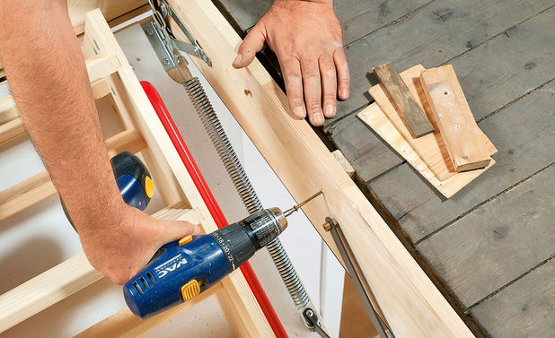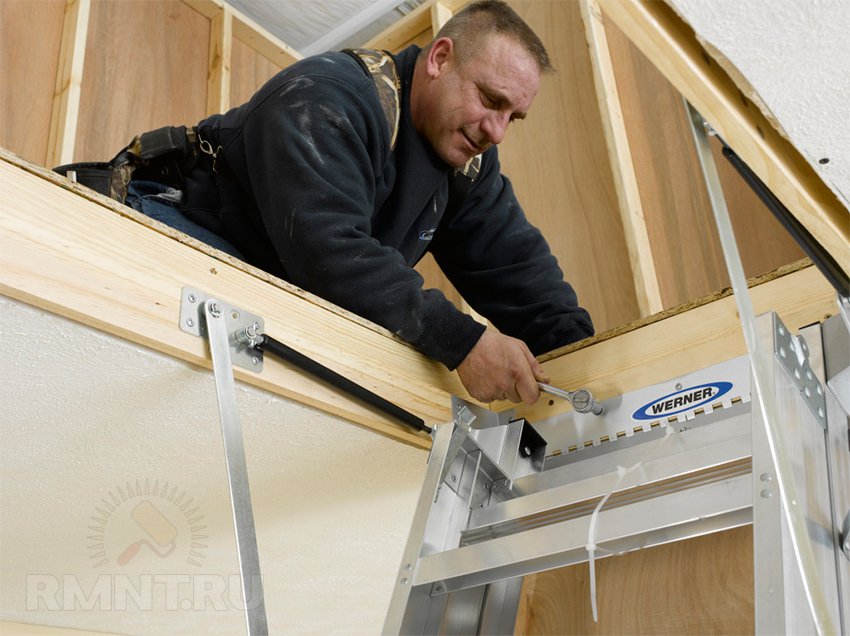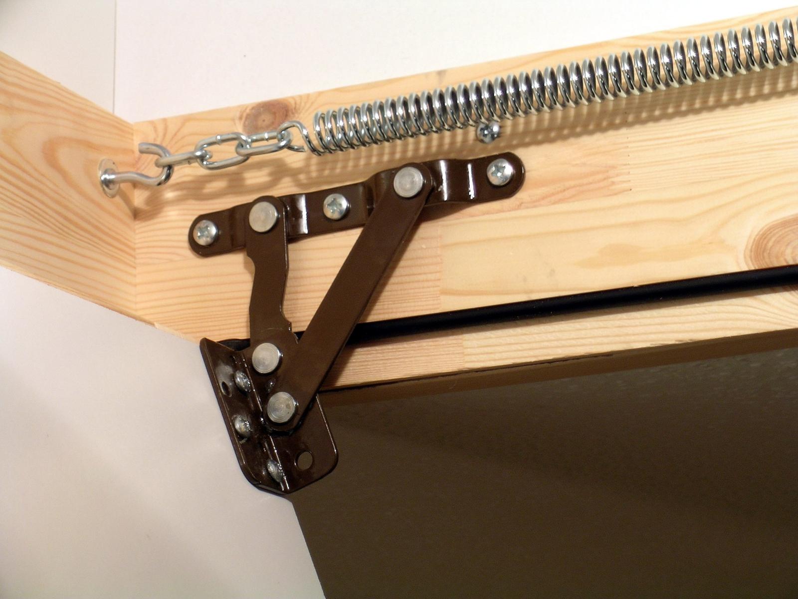 - Installieren und reparieren Sie den Hebemechanismus. Es ist notwendig, die Treppen- und Deckenkonstruktionen zu kombinieren. Um dies zu erreichen, sollte der obere Teil der Leiter an der starren Basis der Luke anliegen. Verbinden Sie die oberen Teile der Tragbalken mit der Türunterseite. Um alle Schrauben zu reparieren.