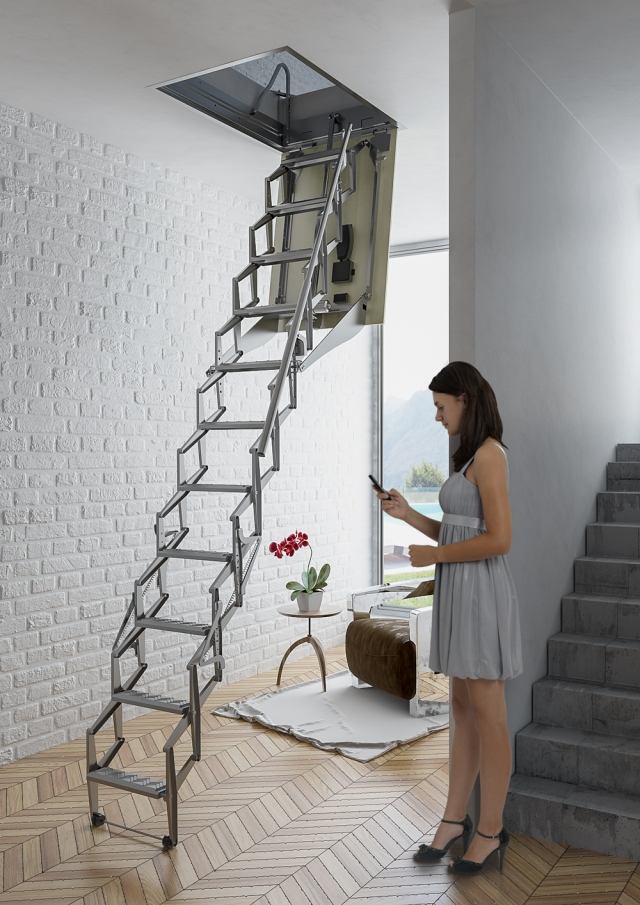 Die gesamte Struktur wird sich leicht zersetzen und einsatzbereit sein. Attische Treppen sind selten mit einem elektrischen Antrieb ausgestattet, der durch den Einsatz einer Fernbedienung gesteuert wird.