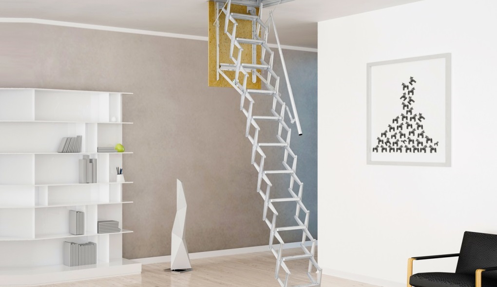 - Falten. Die häufigste Form von Bodentreppen in Häusern mit einer kleinen Fläche,wo es unmöglich ist, ein stationäres zu setzen. Faltbare Designs sind Scheren, Teleskop, Falten und Falten.