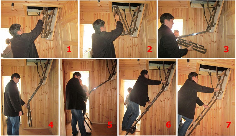 In der Regel wird der Klappmechanismus von Dachkonstruktionen durch eine Handbewegung gesteuert. Normalerweise genügt es, den Griff der Luke oder einen speziellen Hebel zu ziehen, um die Tür zu öffnen. Und auch manuell ist es notwendig, den unteren Teil der Leiter zu ziehen, dank dessen sich die ganze Struktur entfaltet und fest auf dem Boden wird. Spezielle gummierte Spitzen an den "Beinen" der Leiter ermöglichen es, sie in der gewünschten Position zu fixieren und keine Rutschgefahr zu haben.