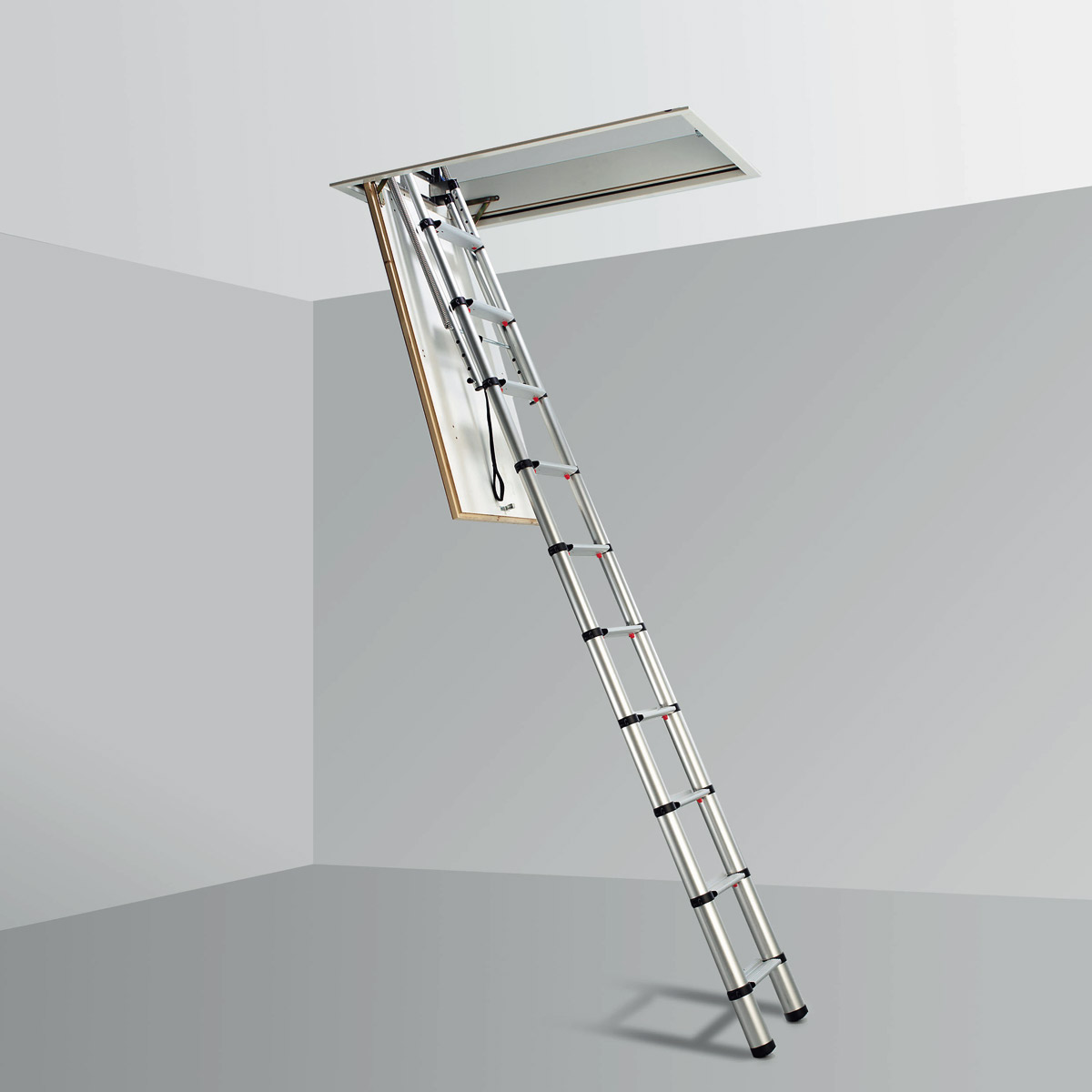 Der Deckenteil ist fest mit dem Deckel der Luke verbunden, die zum Dachboden führt. Daher sollte die Leiter im gefalteten Zustand die gleiche Fläche wie die Innenfläche der Luke haben.
