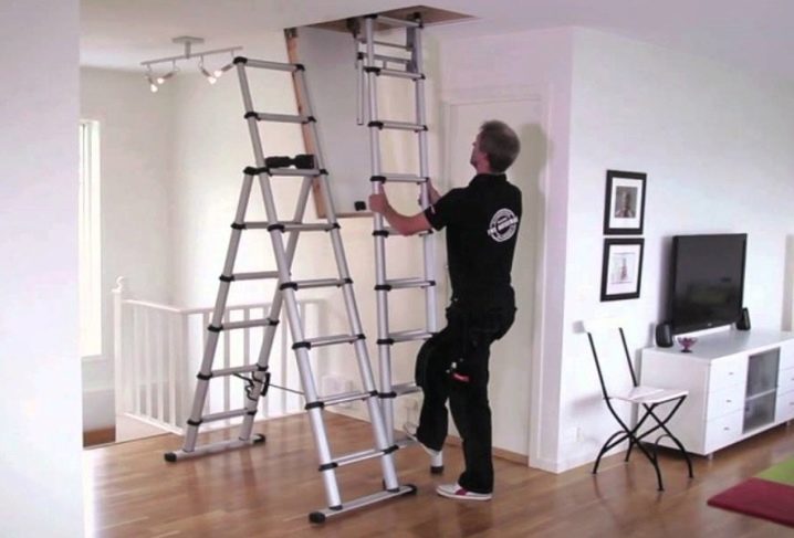 - Scheren und Teleskopleitern können nur aus Metall hergestellt werden. Aluminiumrohre des zweiten Typs sind leicht, aber nicht stark genug, so empfehlen Experten die Verwendung der teleskopischen Option, bei der es nicht notwendig ist, das Dachgeschoss täglich zu besuchen.Die Stahlprofile der Scherendachkonstruktion haben eine sehr starke Struktur und sind praktisch keiner mechanischen Beschädigung ausgesetzt. Es sollte daran erinnert werden, dass die Metallleiter viel härter ist, aber auch haltbarere Geräte aus anderen Materialien.