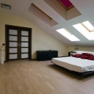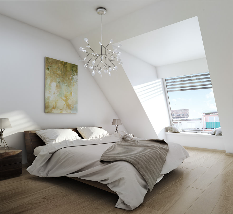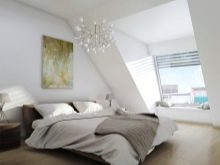 Aktuelle Look-Optionen für die Fertigstellung des Dachbodens im modernen Stil. Für das Dachfenster können Sie einen Mahagoni-Rahmen wählen, die Wände mit Textiltapeten dekorieren und den Raum unter dem Dach mit einem massiven Kronleuchter schmücken. Dies ist eine ausgezeichnete Option für die Einrichtung eines Schlafzimmers oder Wohnzimmers. Möbel, die zu einem solchen Interieur gehören, werden relativ einfach sein, wobei sie nicht unbedingt das ganze Haus in einem streng einheitlichen Konzept halten müssen, weil Moderne interessant mit Neoklassik und Eklektizismus kombiniert werden kann.