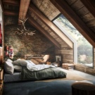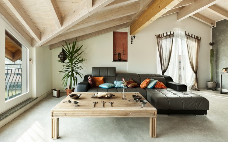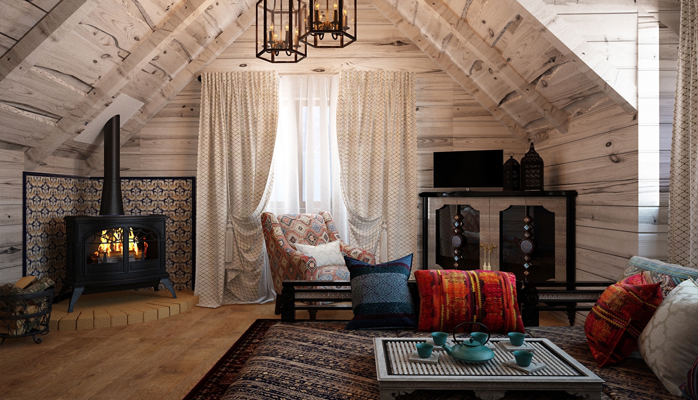 - Im Dachgeschoss eines Privathauses können Sie ein stilvolles und interessantes Wohnzimmer im Chalet-Stil einrichten. Dieses Design war einst charakteristisch für Dorfhäuser in den Alpen, aber dann wurde es überall auf der Welt populär. Unbehandeltes Holz eignet sich für die Deckengestaltung und wird auch perfekt mit Stein- und Keramikfliesen kombiniert. Ledermöbel und massive Teppiche ergänzen das Interieur.