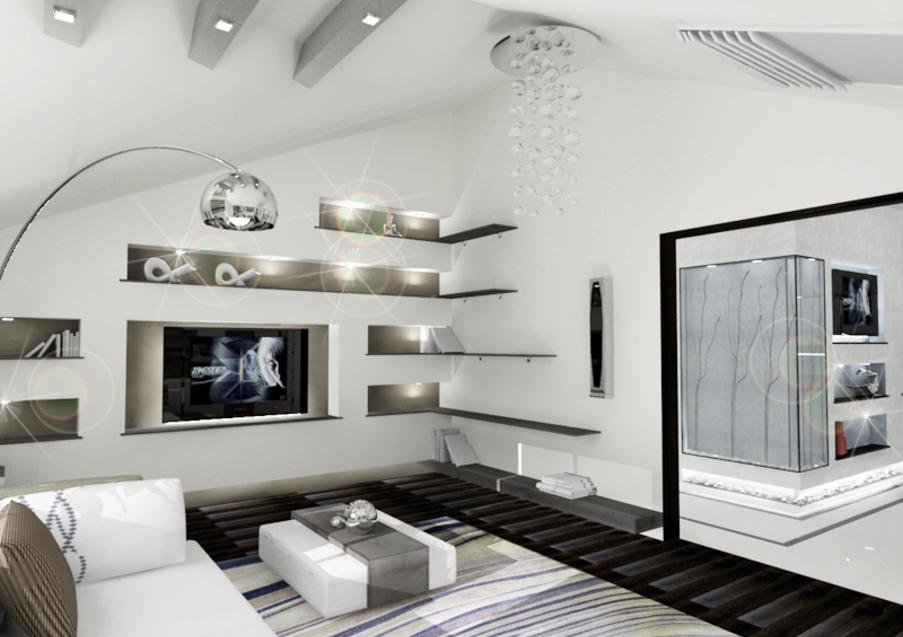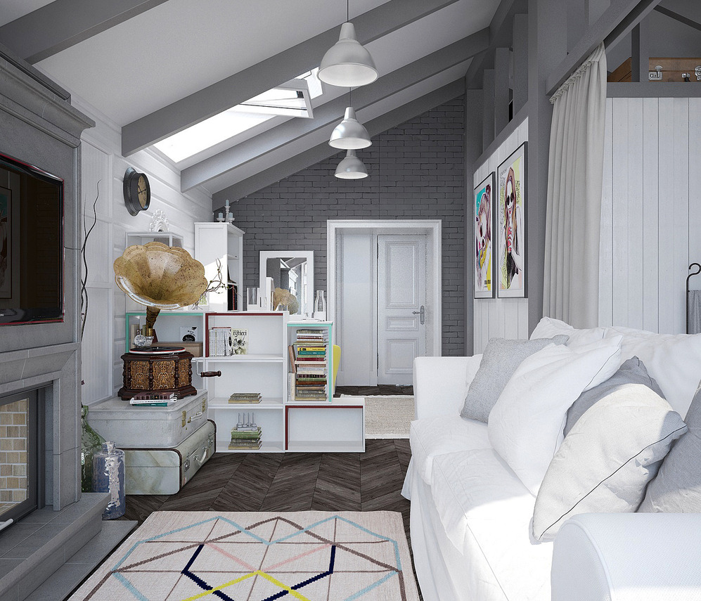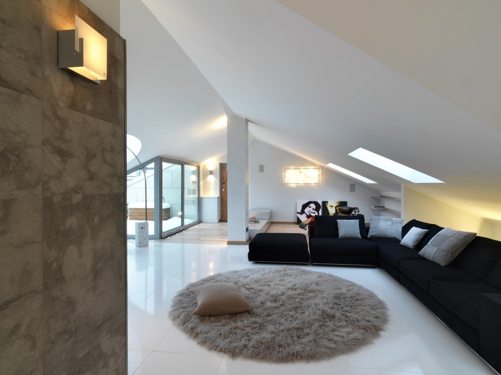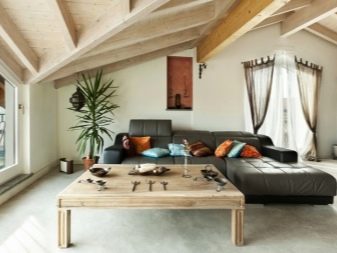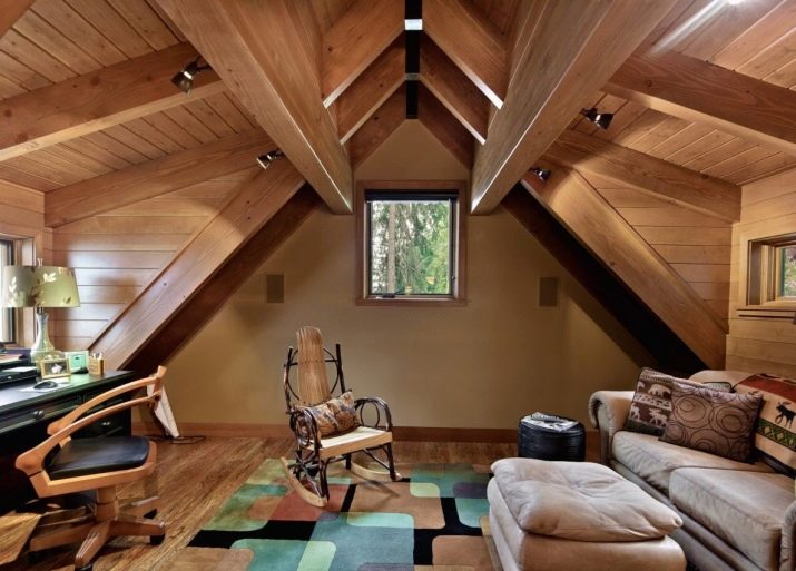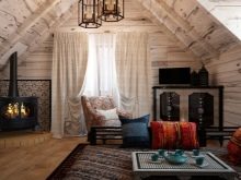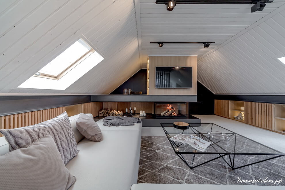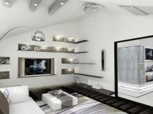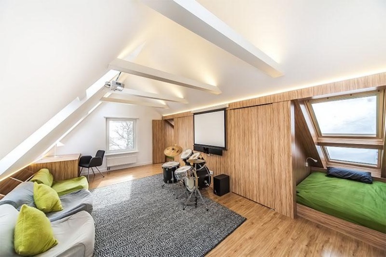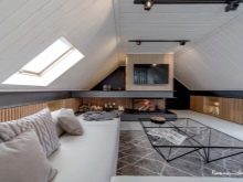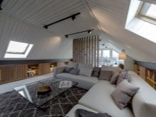 - Kann im Dachboden und Wohnzimmer gemacht werden. Sie kann Single oder Extra sein, wenn Sie eine große Familie haben. Sessel, Couchtisch und TV - alles, was Sie für dieses Zimmer brauchen. Um dem Innenraum ein ungewöhnliches Aussehen zu geben, können Sie eine Beleuchtung mit farbigen LEDs, dekorativen Balken oder großen Teppichen mit einem langen Nickerchen in Erwägung ziehen. Der Dachboden wird ein angenehmer Ort sein, um sich mit Freunden oder Familiengesprächen, Brettspielen und Filmen zu treffen.Nun, wenn Sie die Möglichkeit haben, ein großes Fenster zu machen, weil es am besten ist, die Sterne vom Dachboden zu bewundern.
