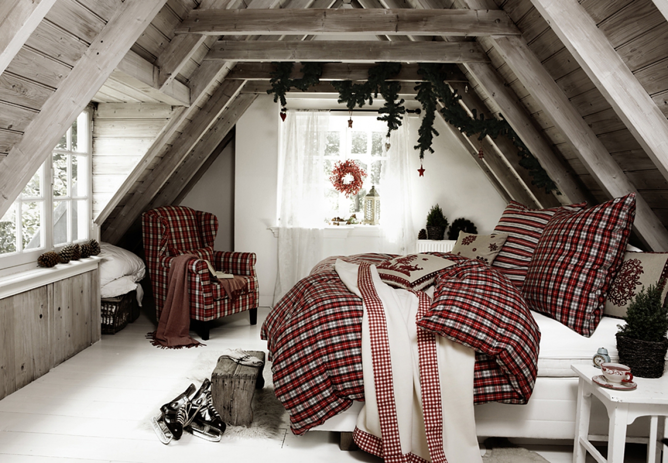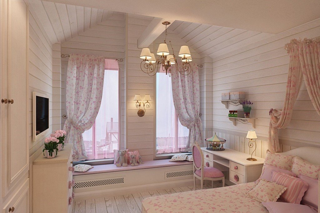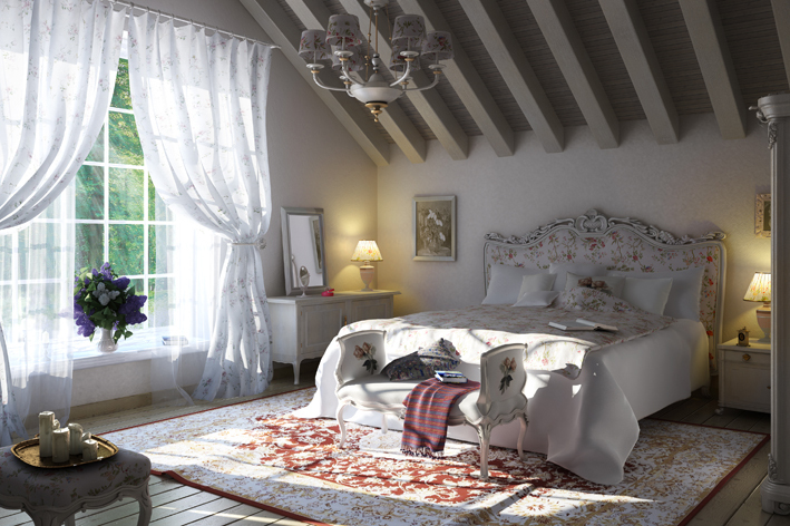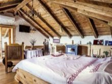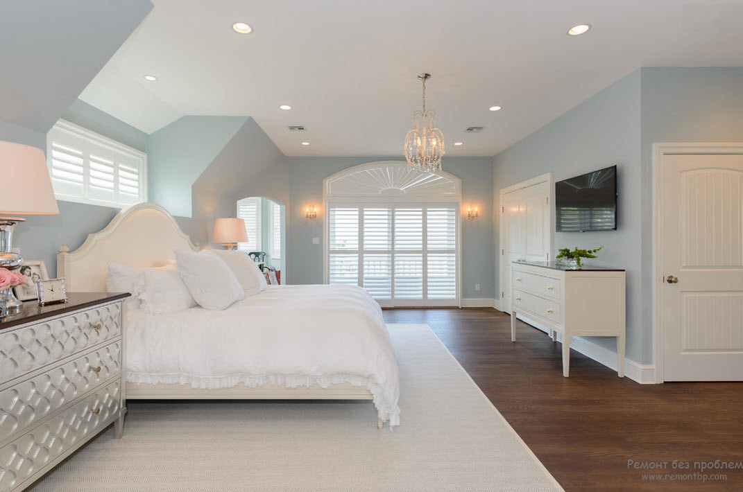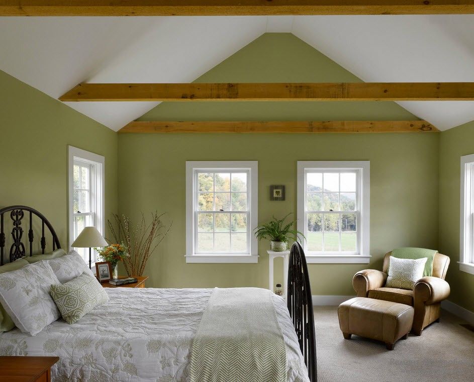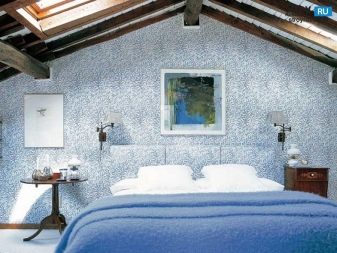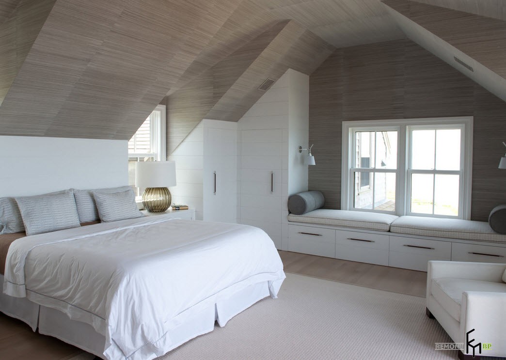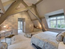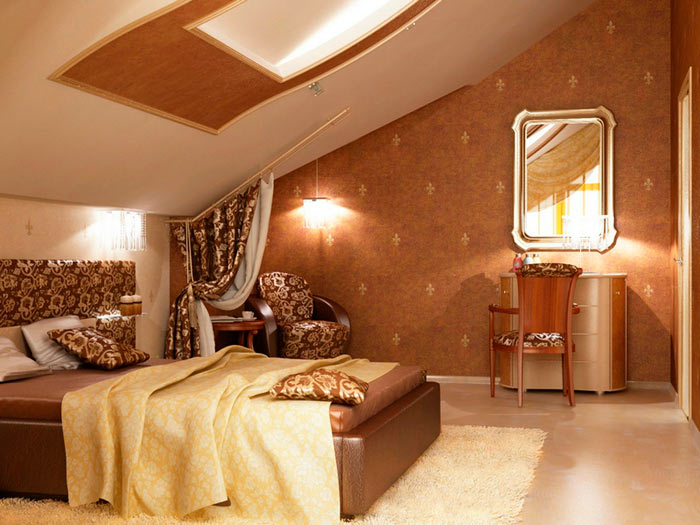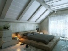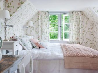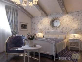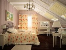 - In einem Wohnhaus im Dachgeschoss stellen viele ein Schlafzimmer. Dies ist eine gute Option, weil die Decken auf dem Dachboden in der Regel niedrig sind, und die Fenster - klein. Dank des dreieckigen Daches im Raum können Sie ein einzigartiges Interieur mit einer besonderen Atmosphäre schaffen. Besonders relevante Optionen im provenzalischen Stil oder Landhausstil.Selbst wenn Sie einen sehr kleinen Dachboden haben, ist es durchaus möglich, ein Schlafzimmer auszustatten, da dies ein Minimum an Möbeln erfordert. Für das kompakteste Zimmer genügt ein niedriges Bett und ein paar Nachttische mit Lampen.