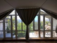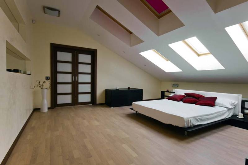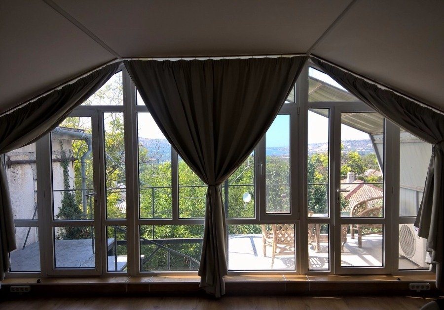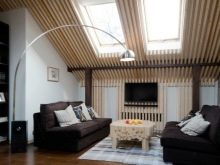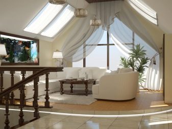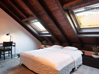 In modernen Häusern werden häufig Panoramafenster hergestellt, die einen wesentlichen Teil des Daches bedecken. Diese ausgezeichnete Lösung wird den Raum besonders angenehm und gemütlich machen. Wenn Sie jedoch den Dachboden unter dem Schlafzimmer ausstatten, müssen Sie sich um die Vorhänge oder Jalousien kümmern.