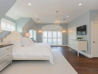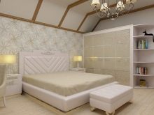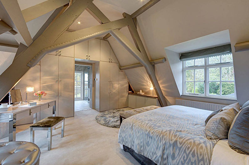 Für die Anordnung des Schlafzimmers in einem kleinen Dachboden ist es besser, ein Minimum an Möbeln zu nehmen. Ein Bett, mehrere Nachttische, ein Kleiderschrank oder eine Truhe bilden ein funktionales und prägnantes Set. Wenn viel Platz vorhanden ist, können Sie einen Frisiertisch, eine Frisierkommode, eine Ottomane und zusätzliche Schränke im Raum aufstellen. Sie können den Raum sogar in mehrere Zonen unterteilen (z. B. eine Schlafzone und eine Zone mit einem Spiegel und Schränken).