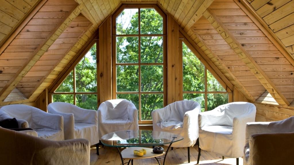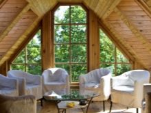 - Auf dem Dachboden sehen große ungewöhnliche Fenster aus. Zum Beispiel können Sie eine Panoramaverglasung an der ganzen Wand oder um ungewöhnliche Fenster machen. Eine dieser Optionen kann ein Highlight des Interieurs sein.
