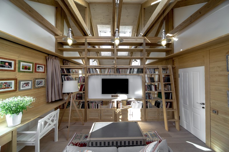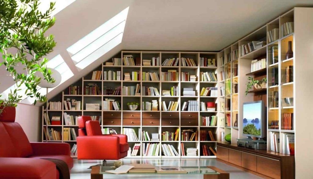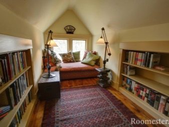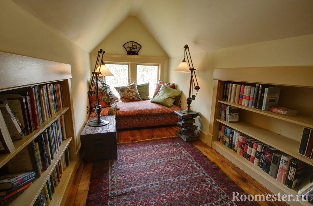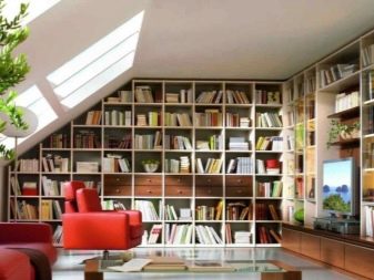 - Wenn Sie Bücher mögen und eine große Sammlung haben, Der Dachboden kann als Bibliothek dienen. Es ist genug, ein paar Regale, ein paar Stühle und einen Couchtisch zu stellen.Attic Raum eines Privathauses kann ein ruhiger und gemütlicher Ort sein, ideal zum Entspannen mit einem guten Buch.