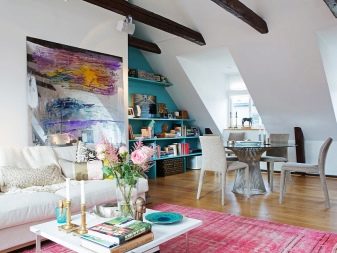 Für eine gelungene Anordnung des Dachbodens ist die Auswahl der richtigen Farbkombinationen. Denn wenn die kleinen Details des Interieurs unbemerkt bleiben, fallen die Primärfarben sofort ins Auge und beeinträchtigen den Eindruck und die Stimmung im Raum.