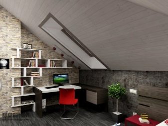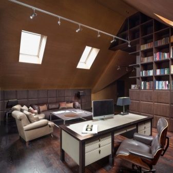 Wenn Sie planen, ein Büro auf dem Dachboden, ein Studio für Ihr Hobby oder eine Bibliothek einzurichten, sollte die Einrichtung des Raumes ziemlich minimalistisch sein.Wählen Sie Möbel nach Ihren Bedürfnissen und betrachten Sie erst dann die dekorativen Elemente.