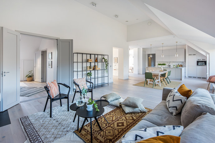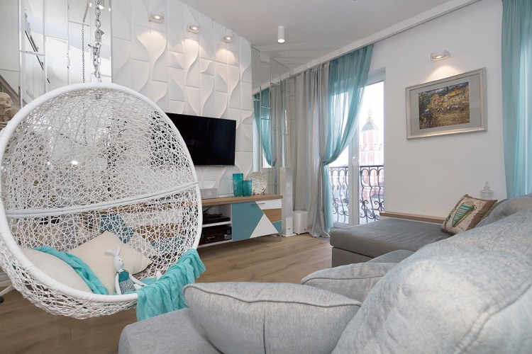 Eine bequeme Passage ist in jedem Raum wichtig, also versuchen Sie, alle hohen Möbel in der Nähe der parallelen Wände zu platzieren. Auf dem Dach können Sie Polstermöbel und Tische aufstellen.