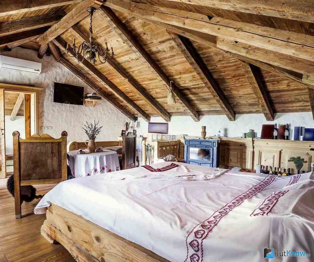 Oft sind hölzerne oder sogar gemauerte Landhäuser im Landhausstil eingerichtet. Rustikale Ästhetik lässt Sie einen Teil der Natur fühlen und umgibt Sie mit angenehmen natürlichen Materialien (Holz wird hauptsächlich in der Dekoration verwendet). Die Decke des Dachbodens im Stil des Landes kann mit Schindeln ausgelegt und mit Balken dekoriert werden. Die Einrichtung der Wände und des Bodens ist in diesem Fall meist ebenfalls aus Holz.Textil- und Lederelemente sowie Teppiche mit langem Nickerchen, die Tierhäute imitieren, können ein solches Design organisch ergänzen.