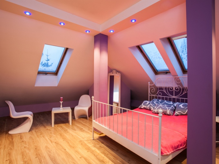 Es lohnt sich auch, von der Größe des Zimmers auszugehen. Am schwierigsten ist die Einrichtung eines kleinen Dachbodens, den Sie optisch erweitern möchten. Zu diesem Zweck ist es üblich, helle Farbtöne zu verwenden und auch auf ein Paar Grundfarben zu beschränken.Keine Notwendigkeit, den Raum mit einer übermäßigen Vielfalt von Farben zu überladen.