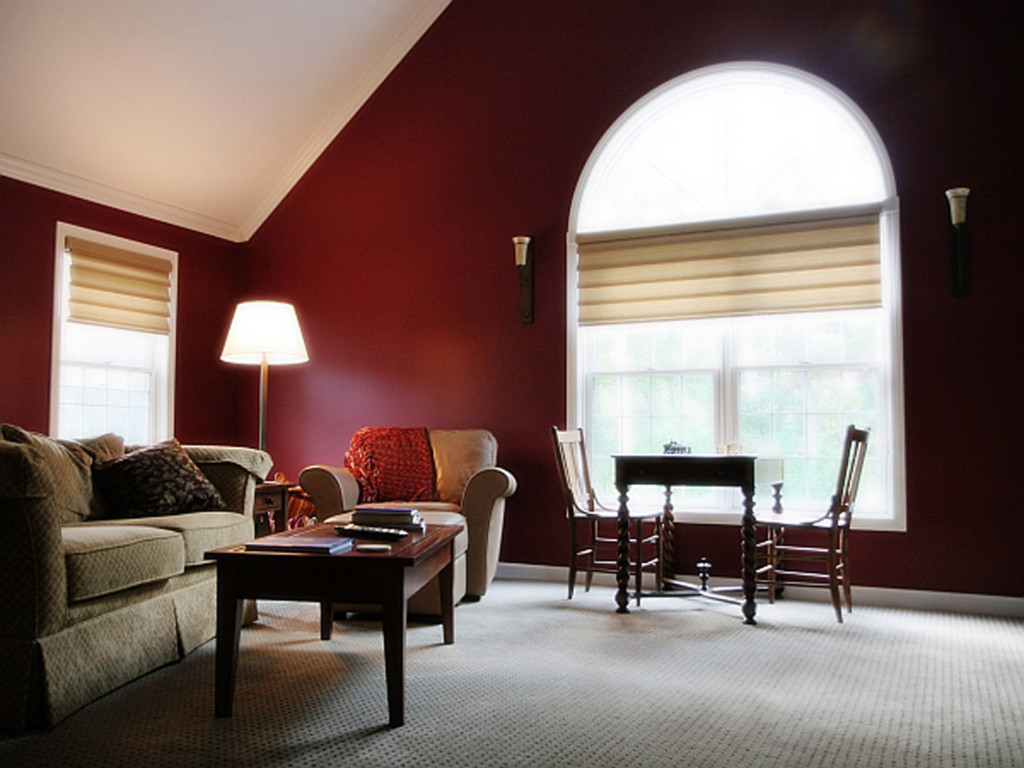 - Für Wohnzimmer, Studium oder Bibliothek kann verwendet werden dunkle weinrote Töne. Sie werden das Interieur interessant machen, aber im Gegensatz zu den helleren Rottönen nicht zu eingängig wirken. Sie können Burgunder mit Grau, Beige, Blau oder Weiß kombinieren. Es ist fast universelle Farbe, die erfolgreich alle anderen Schattierungen abschirmt. Es ist wert, vielleicht zu vermeiden, dass Rosa und Violett Töne, vor allem ist es nicht empfehlenswert, warme und kalte Schattierungen von einer Farbe zusammen zu kombinieren. Um die Farben zu variieren, können Sie Accessoires in Metallic, Elfenbein und Details in Beige und Ocker wählen.