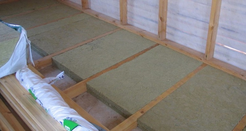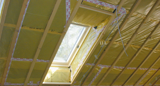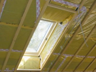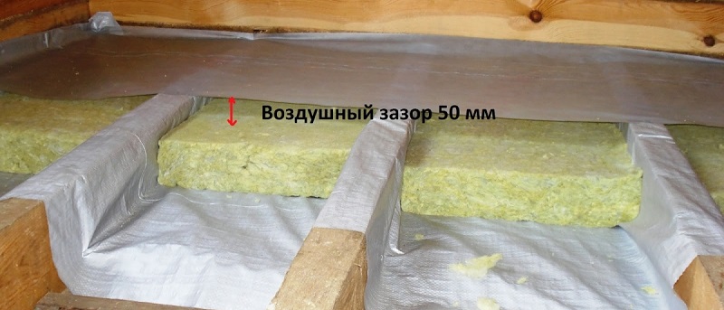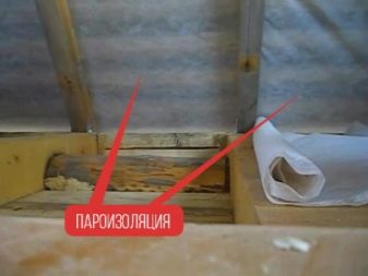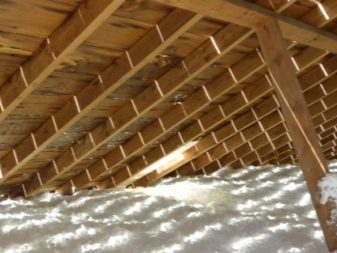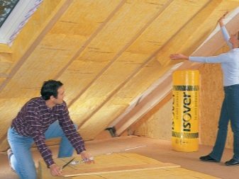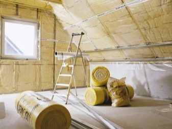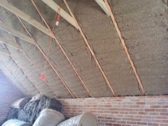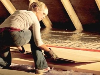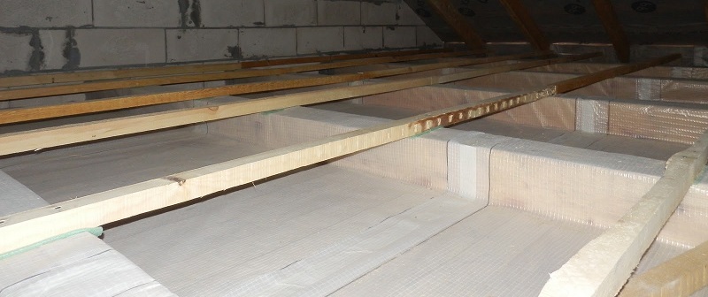 Wenn es erforderlich ist, die Decke mit Mineralwolle zu erwärmen, wird zuerst eine Dampfbremsschicht auf den Boden gelegt und nachgestellt. In der Regel können Folien, Polyethylen oder eine spezielle Membran verwendet werden, um eine solche Schicht zu erzeugen. Es wird überlappend verlegt, die Fugen werden mit Leim bestrichen, danach werden die Dämmrollen aufgelegt. Auch Mineralwolle wird zwischen den Sparren platziert.