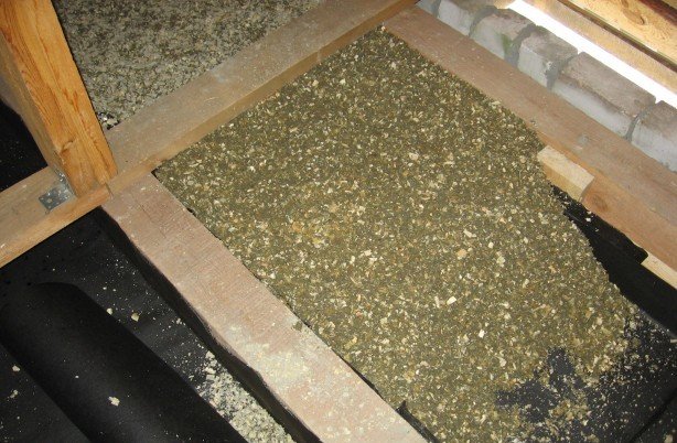 Danach können Sie Sägemehl eingießen. Die Dicke der Schicht sollte bis zu 20 cm betragen.Da Sägemehl ein brennbares Material ist, sollte es mit Schlacke bestreut werden. Dies wird die letzte Stufe sein, da kein Material über Sägemehl nicht mehr passt.