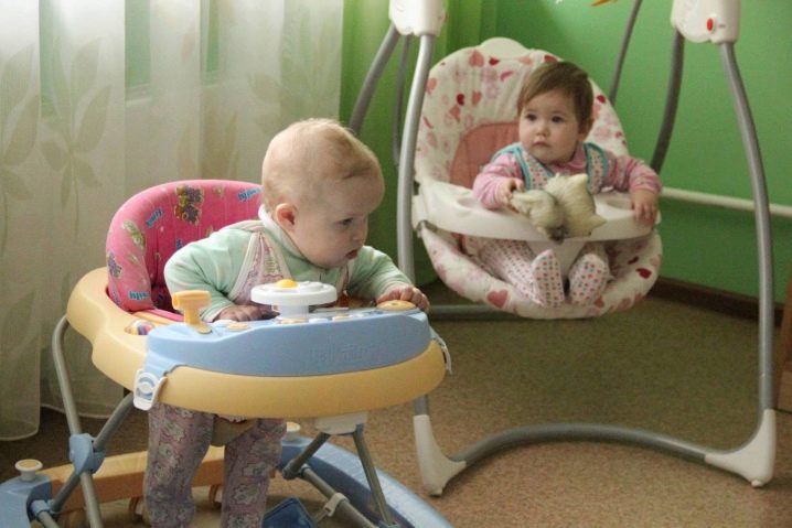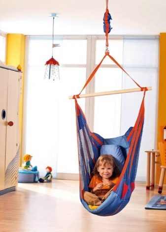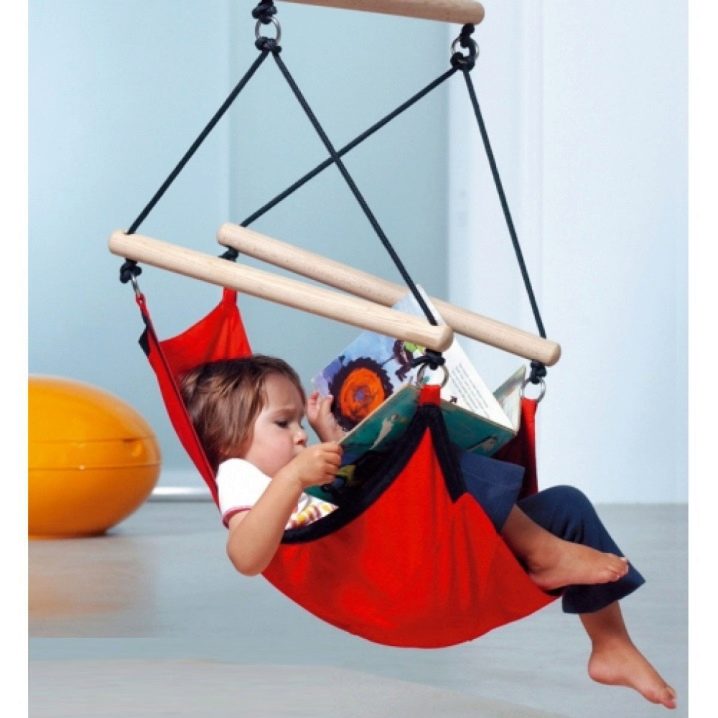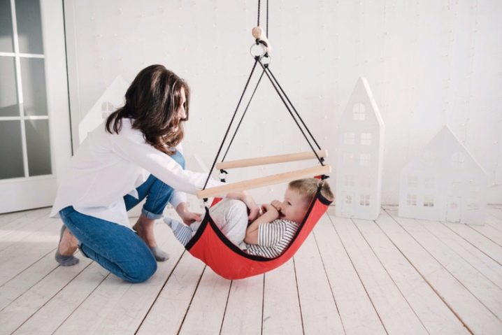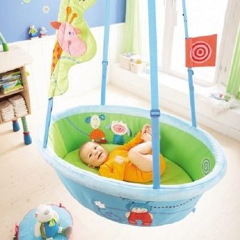 Bis heute gibt es viele Möglichkeiten für Schaukeln in verschiedenen Formen und Materialien. Die beste Wahl für Babys ist ein hängendes Modell mit weichen Seiten aus Stoff mit zwei Löchern für die Beine.