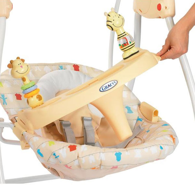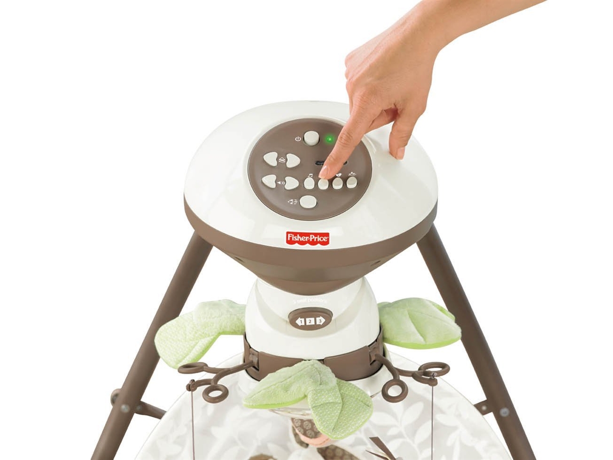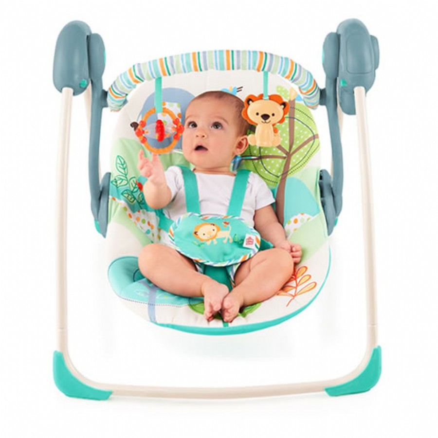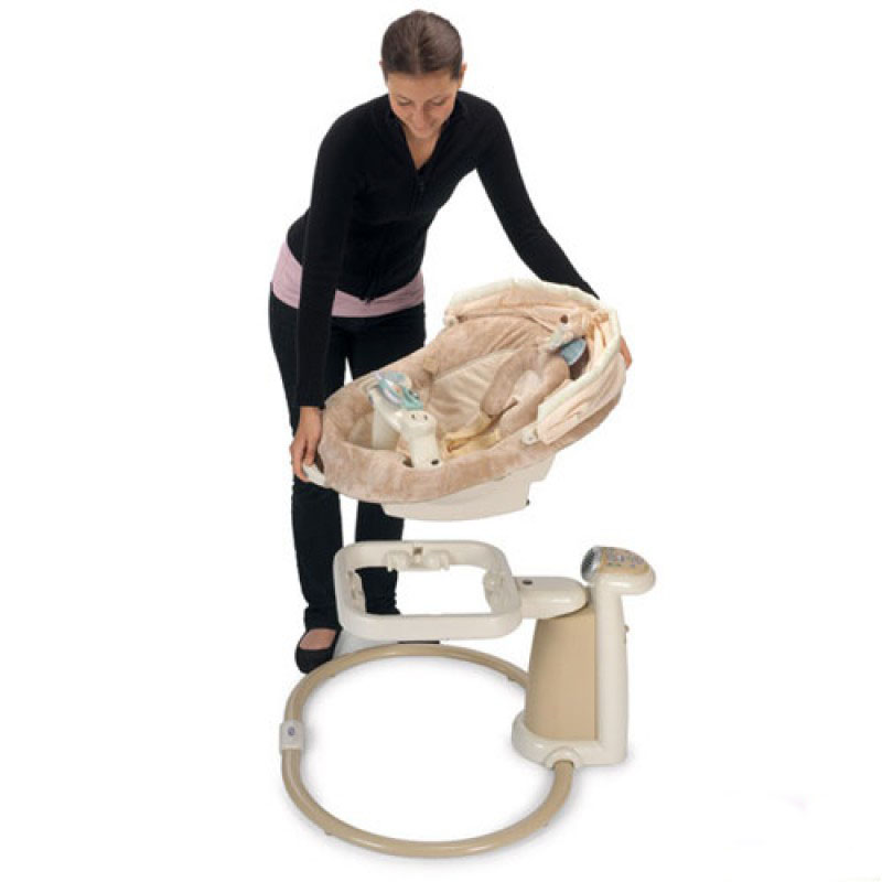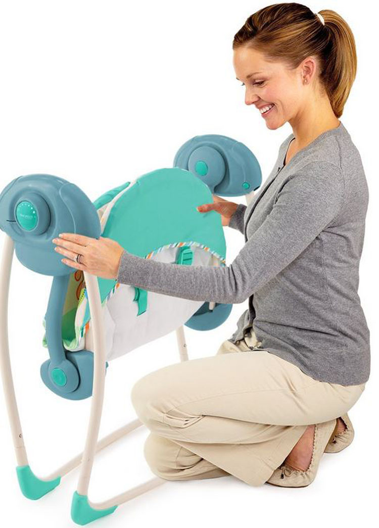Schaukeln der Mittelklasse, die leicht zu falten und auf jeder Reise unverzichtbar sind. Es hat sechs Geschwindigkeiten und sechzehn beruhigende Melodien. Dieses Gerät kann sowohl von einem Netzwerk als auch von Batterien betrieben werden.