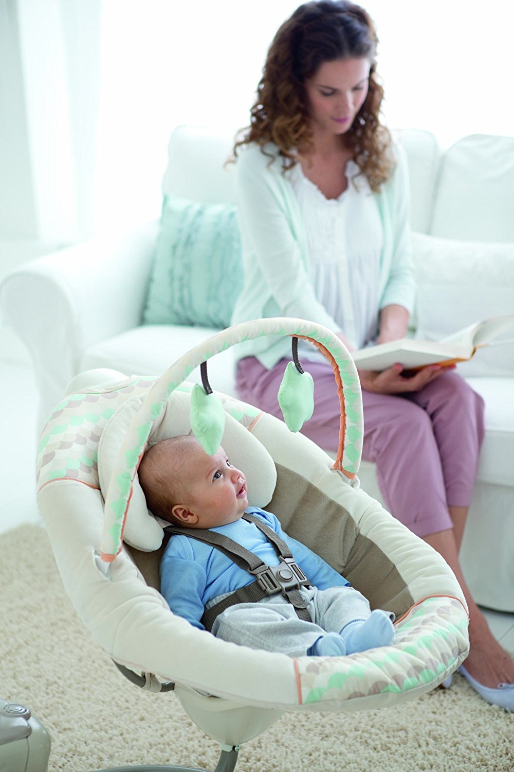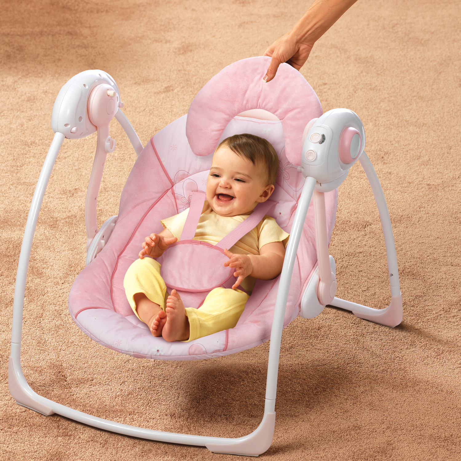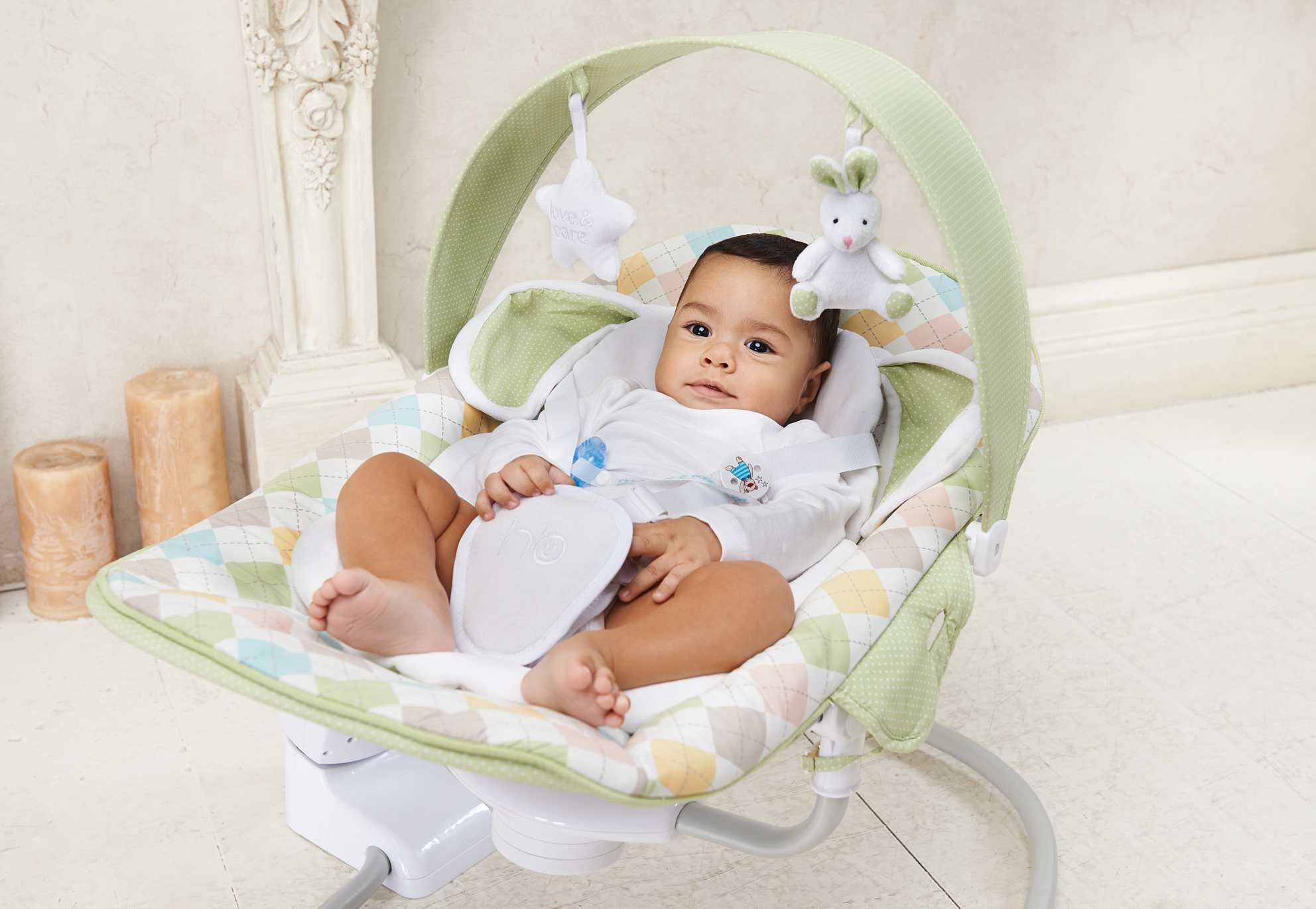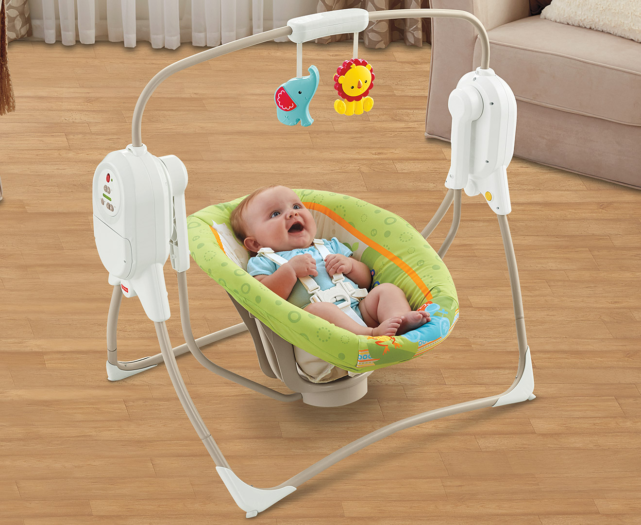 Schaukeln der Mittelklasse, die leicht zu falten und auf jeder Reise unverzichtbar sind. Es hat sechs Geschwindigkeiten und sechzehn beruhigende Melodien. Dieses Gerät kann sowohl von einem Netzwerk als auch von Batterien betrieben werden.