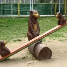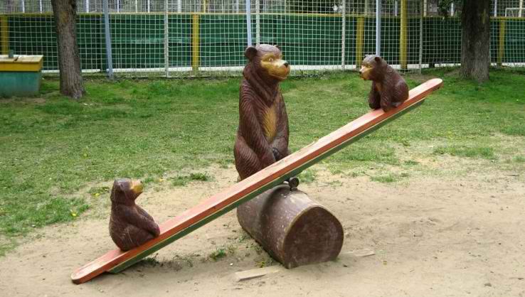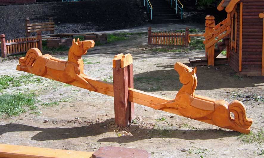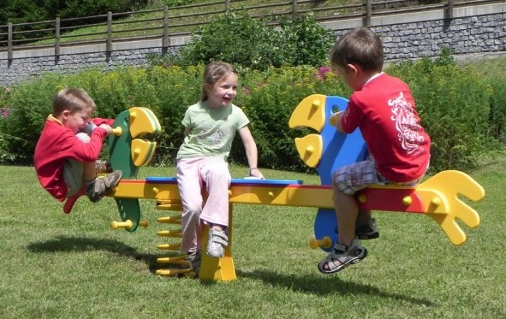 - Schwingpendel (Balance). Brett mit Sitzen an den Rändern, das auf einer Stütze steht und getrieben wird, indem Kinder mit den Füßen von der Erdoberfläche geschoben werden.