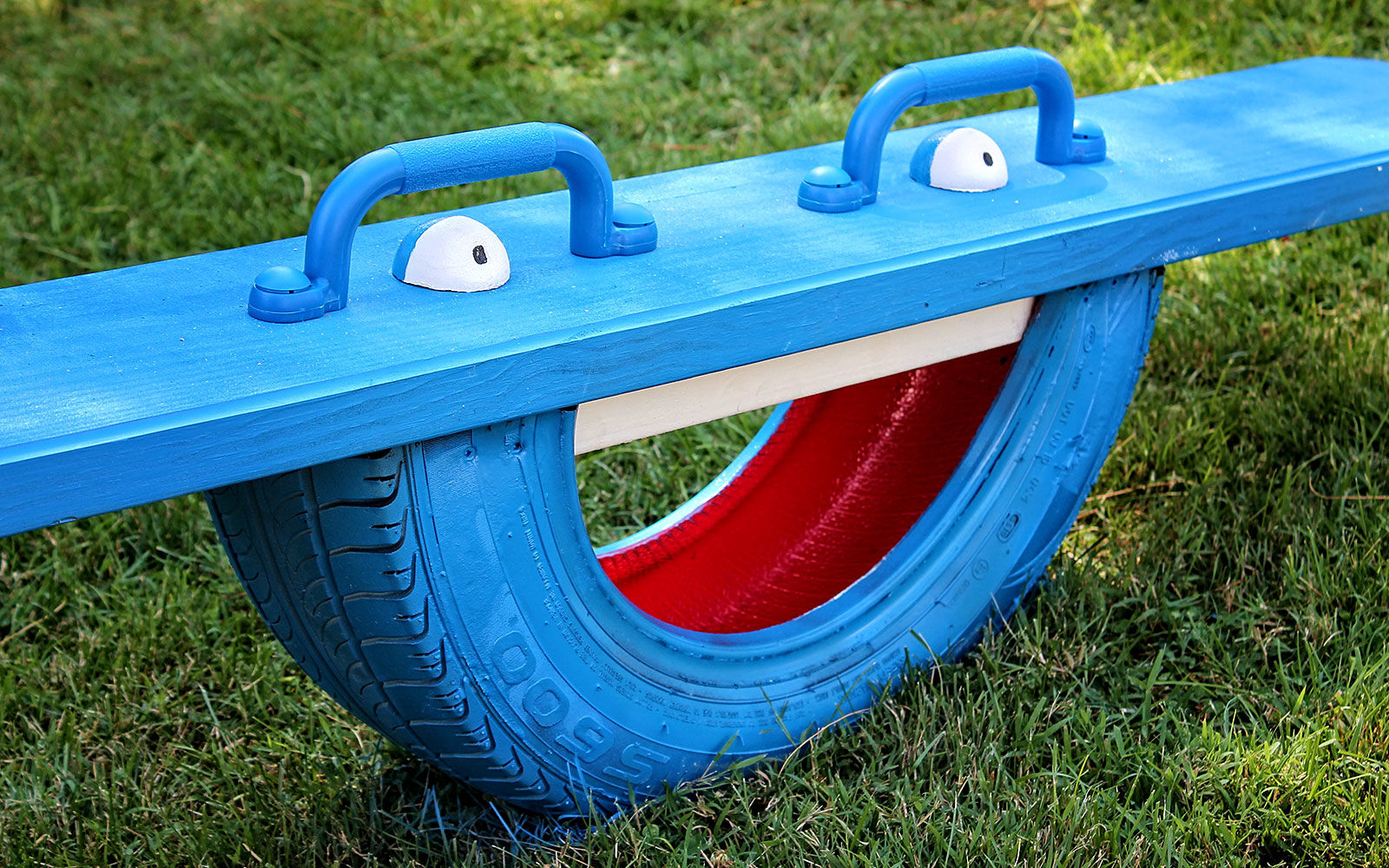 Sie können auch einen Schaukelstuhl aus Reifen machen, indem Sie ihn halbieren und einen Sitz mit Griffen von oben anbringen. Für die kleinsten Reifen an den Kanten sind Begrenzer installiert.