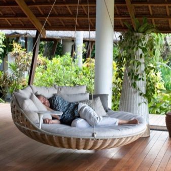 Gartenschaukeln halten bis zu 300 kg Last aus, so dass drei erwachsene Männer sicher auf ihnen ruhen können. In diesem Fall wiegt die gesamte Baugruppe bis zu 70 kg. Das heißt, es kann eine Person installieren. Schaukeln, die in der mittleren Preisklasse liegen, haben eine gute Konfiguration: neben dem Rahmen und dem Sitz sind Kissen, Armlehnen und ein Moskitonetz enthalten. Der Käufer kann aus dem Material und dem Design (Holz oder Metall) einen Rahmen wählen, der möglichst in das umgebende Interieur passt.Merkmal einer guten Gartenschaukel ist die verstellbare Position der Sofalehne. Es kann sowohl vollständig als auch in mehreren Neigungslagen angezeigt werden.
