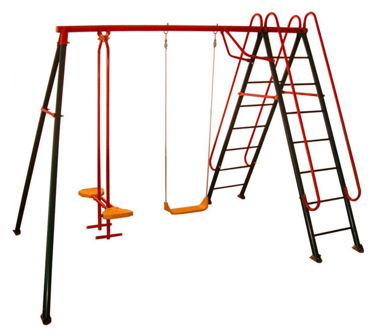 Der stationäre Spiel- und Unterhaltungskomplex "Sun" ist 2 Meter breit. Es besteht aus stahlverstärkten Rohren mit Polymerbeschichtung. Das Paket beinhaltet zwei Arten von Schaukel (Einzelhängung ohne Rückenlehne mit einem Seil undDoppelspiegel mit einem Metallrahmen), doppelseitige Treppe mit Geländern, drei kleine horizontale Leiste, die zwischen den beiden Säulen der Treppe und dem Rahmen, ein Balken montiert sind. Die Schaukelsitze bestehen aus ungiftigem, lichtbeständigem Kunststoff, der den europäischen Sicherheitsstandards entspricht. Das Gewicht der gesamten Struktur beträgt 32 kg, die Belastung eines Sitzes auf der Schaukel sollte 50 kg nicht übersteigen.