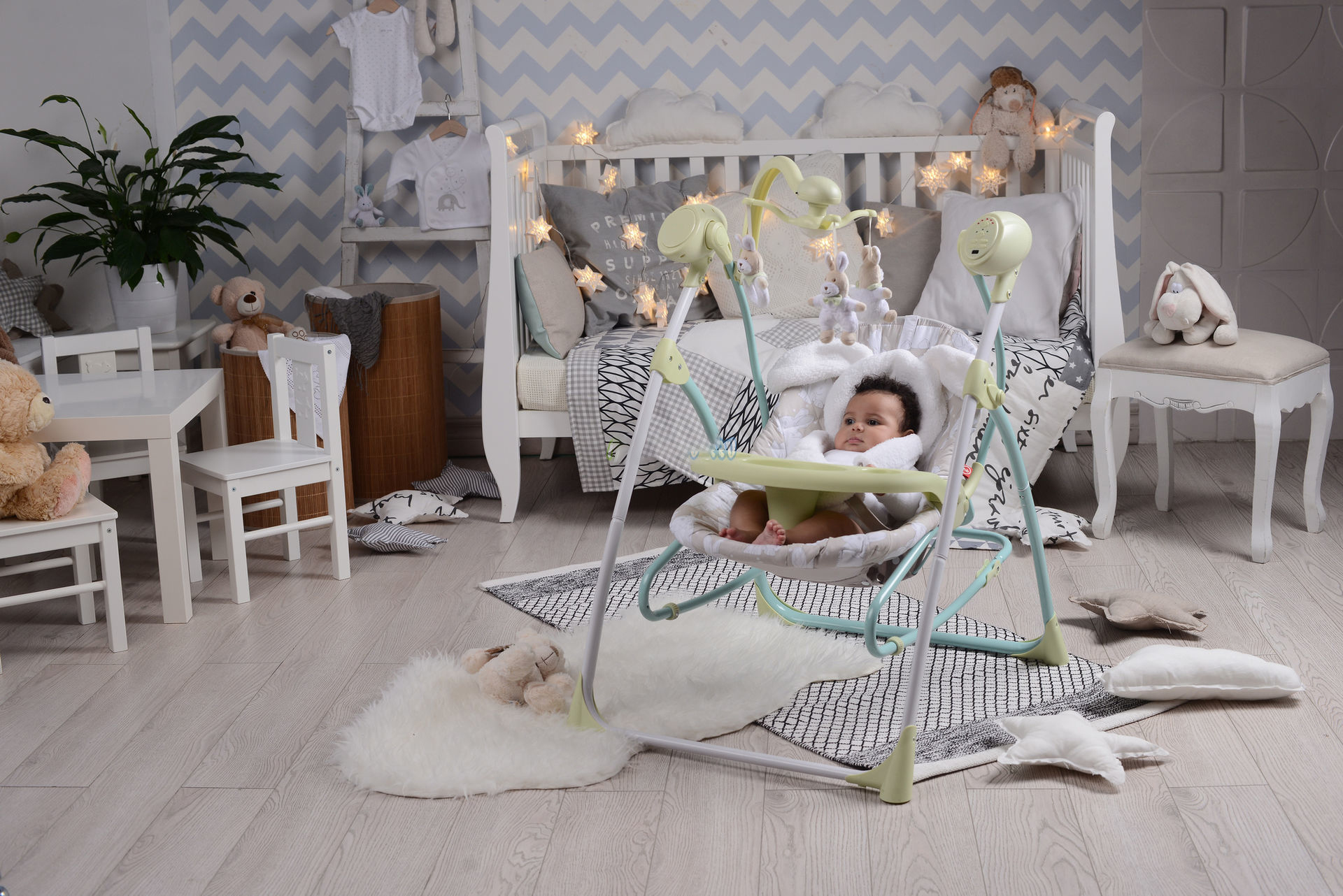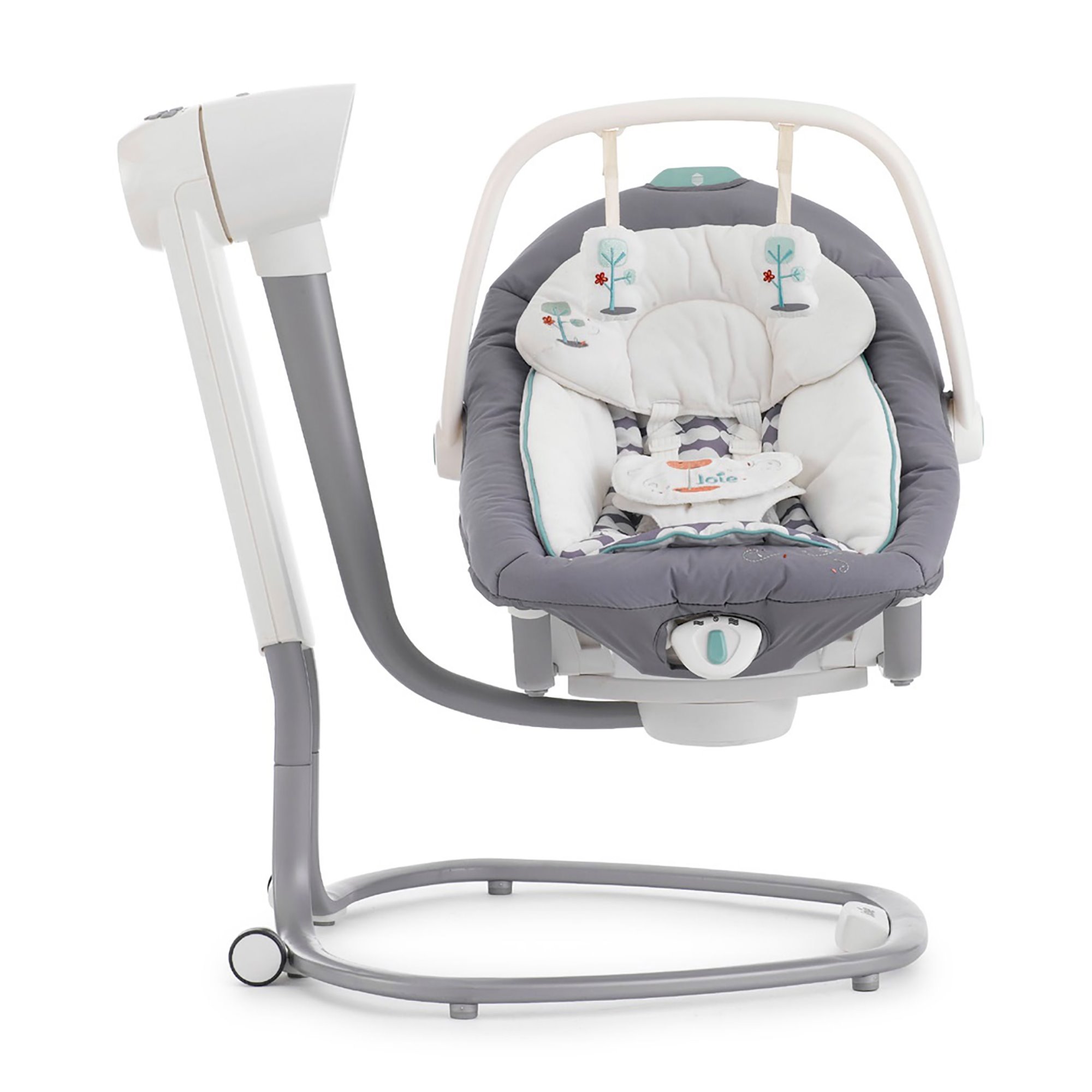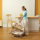 Bright Starts ist ein sehr kompaktes und leichtes Design, das bequem in einem kleinen Kinderzimmer untergebracht werden kann und Sie mit auf eine Reise nehmen können.