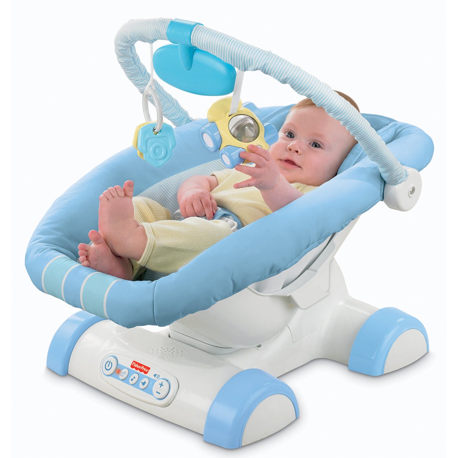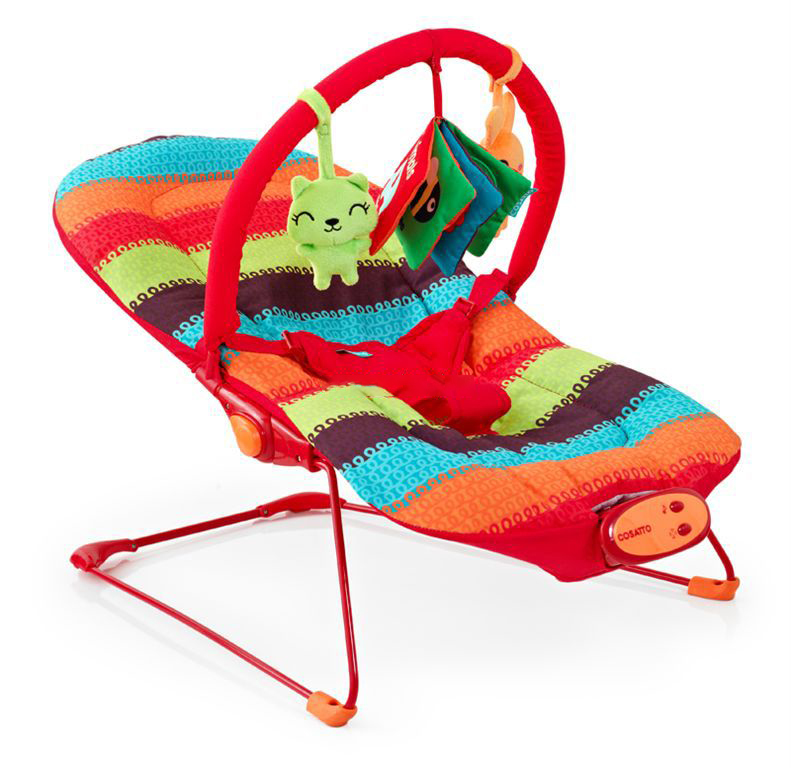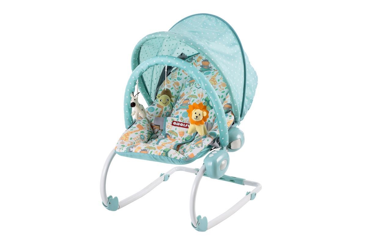 Für die Sicherheit des Babys trifft der Dreipunktgurt. Und zum Schutz vor Sonnenlicht während des Schlafes gibt es eine spezielle Kapuze. Für Unterhaltung, die Chaiselongue ist mit einer Musikeinheit und Vibration ausgestattet, gibt es auch Stofftiere, die das Baby interessieren wird.