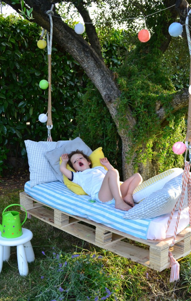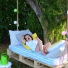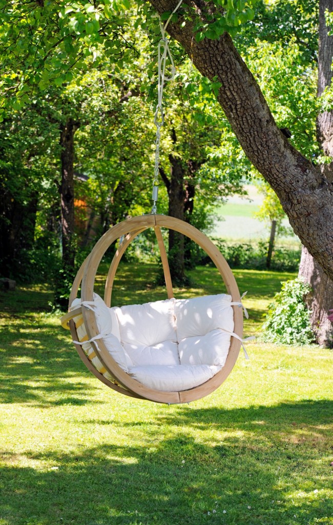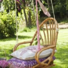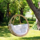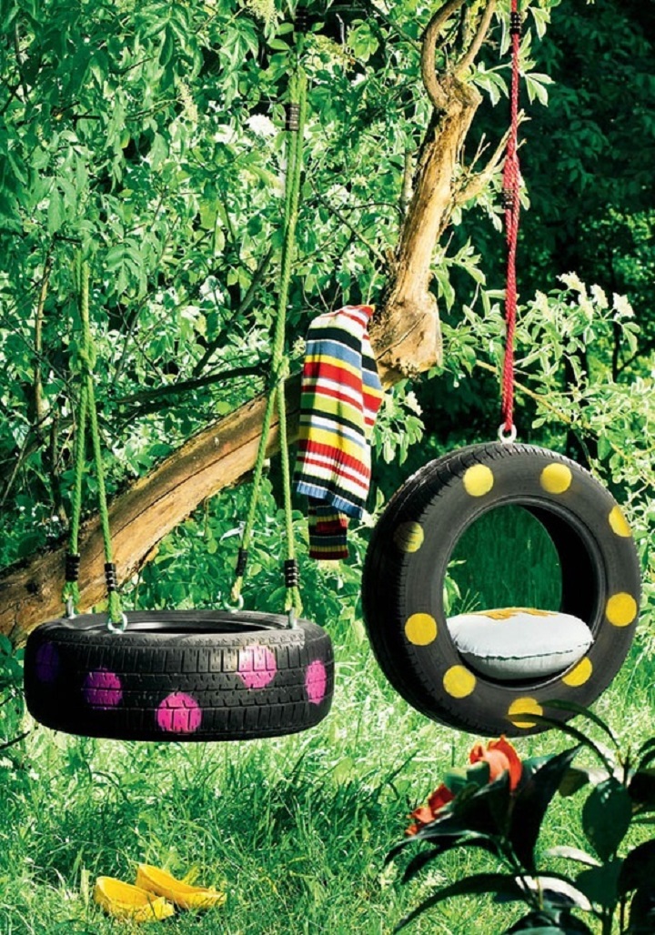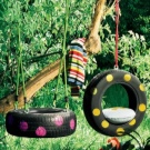 Es gibt viele interessante Ideen für die Installation ungewöhnlicher Schaukeln. Zum Beispiel von Reifenabdeckungen. Das Design ist absolut einfach, es kann an einem Seil oder an einer Kette an einem starken Ast aufgehängt werden. Diese Schaukel, von Hand gemacht, können Sie ein schickes Design geben. Schaukeln aus Ringen (oder Ringe) sehen auch außergewöhnlich aus. Solche Konstruktionen in Landhäusern werden oft "Nester" oder "Spinnennetze" genannt. Es ist wichtig, eine Rahmenbasis zu etablieren, sie wird vom Seil gehalten. Der Sitz ist mit Stoff bezogen und für die Einrichtung werden helle Textilien verwendet.