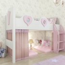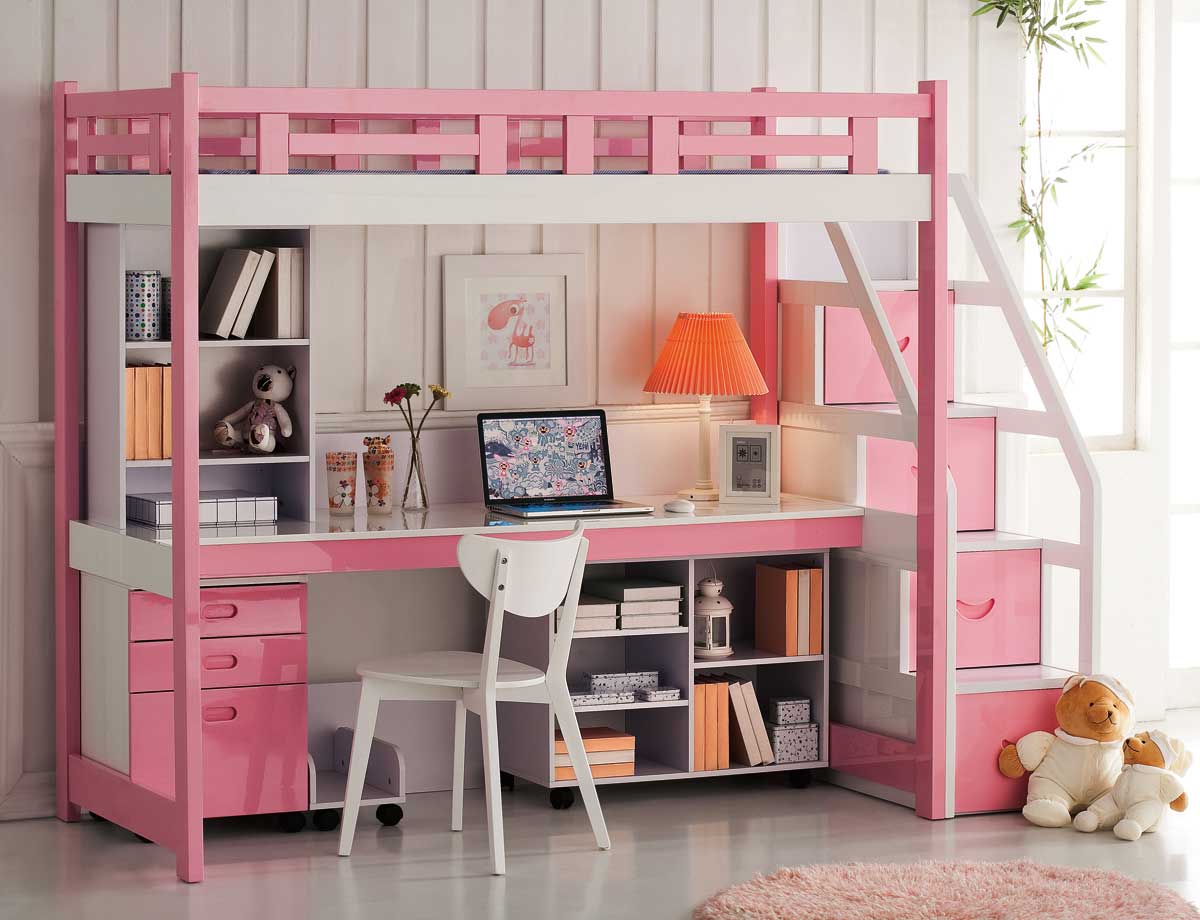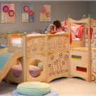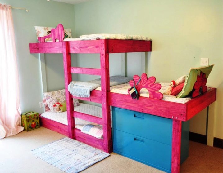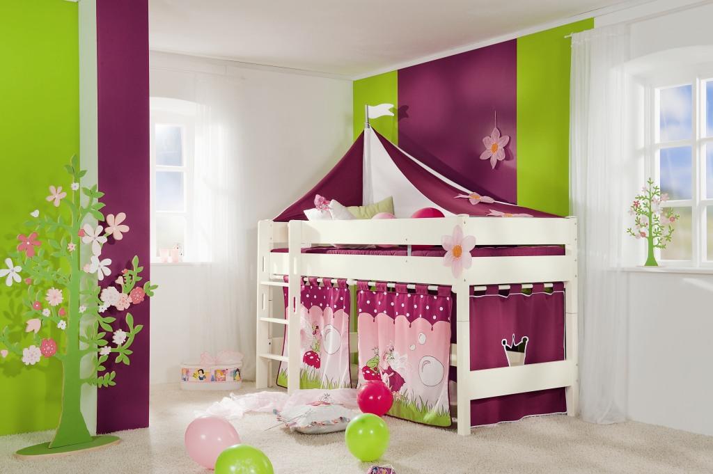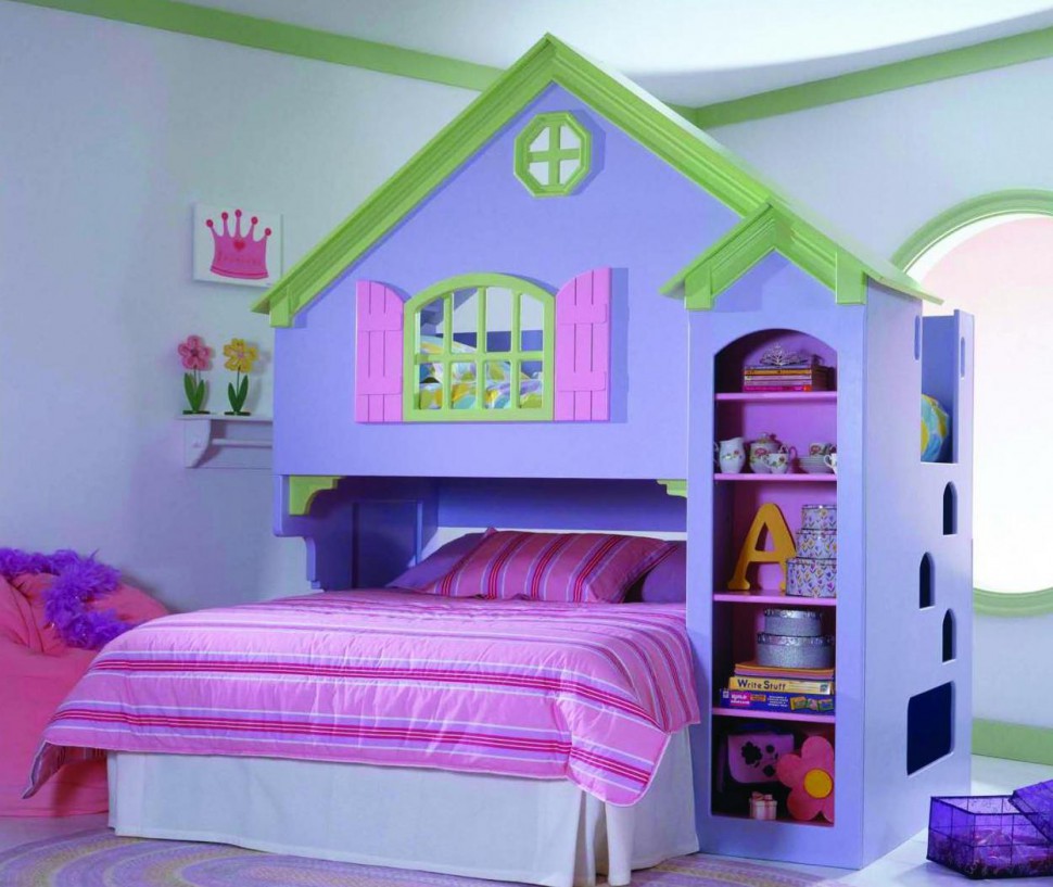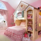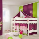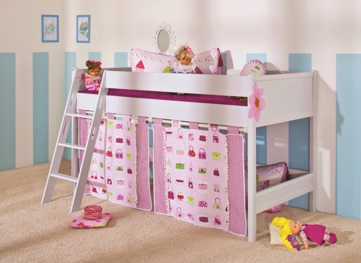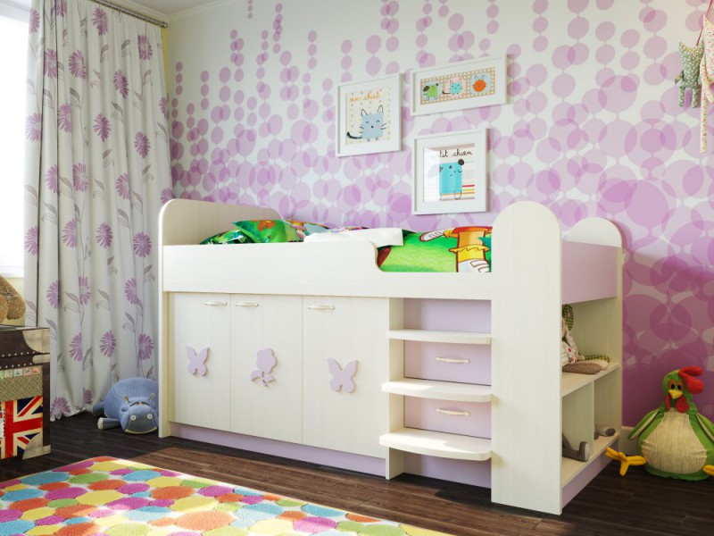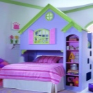 Große Aufmerksamkeit sollte kleinen Dingen gewidmet werden - selbst in diesem Design gibt es Regale für Puppen, geheime Schubladen für Geheimnisse, Schließfächer für Bögen, Haarbürsten. Die Größe solcher Teile kann mit dem Kind abgestimmt werden. Wie das Farbschema, das für Kinderbetten verwendet wird. Mädchen lieben sanftes Rosa, sonniges Gelb, fröhlichen Smaragd.