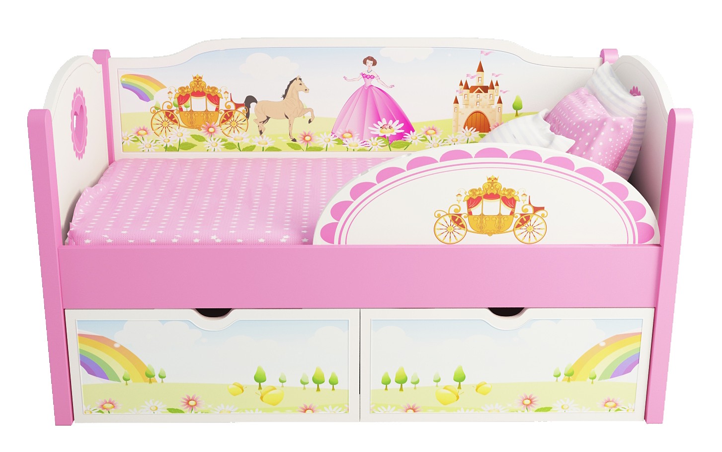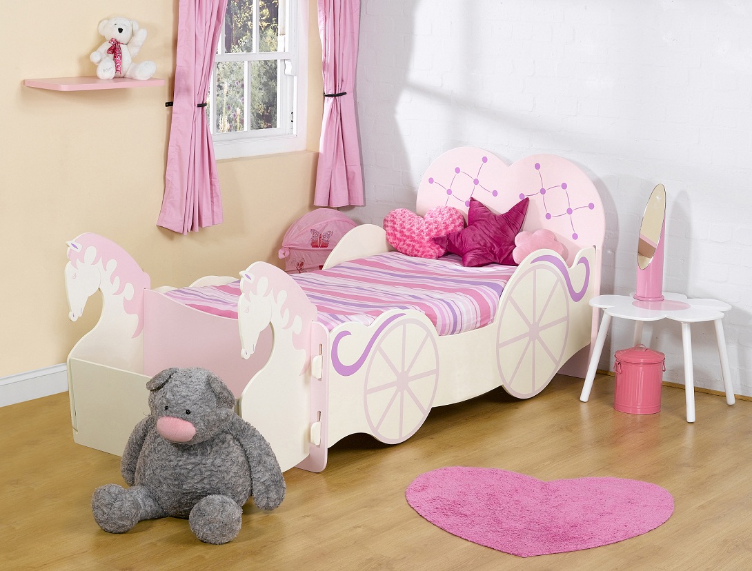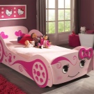 Wenn die Jungen Betten in Form von Maschinen mögen, dann freuen sich die Mädchen über die Schlafzimmermöbel in Form einer fabelhaften Kutsche.Seine Abmessungen können den Parametern des Raums entsprechen. Die Seitenteile können niedrig sein - die Seiten simulieren die Wände des Wagens. Und sie können auch eine integrale Konstruktion sein, die eine echte Kutsche ist - mit Fenstern und einem Eingang. Nachts kannst du darin schlafen und schöne Träume sehen. Und am Nachmittag - drinnen klettern und spielen.