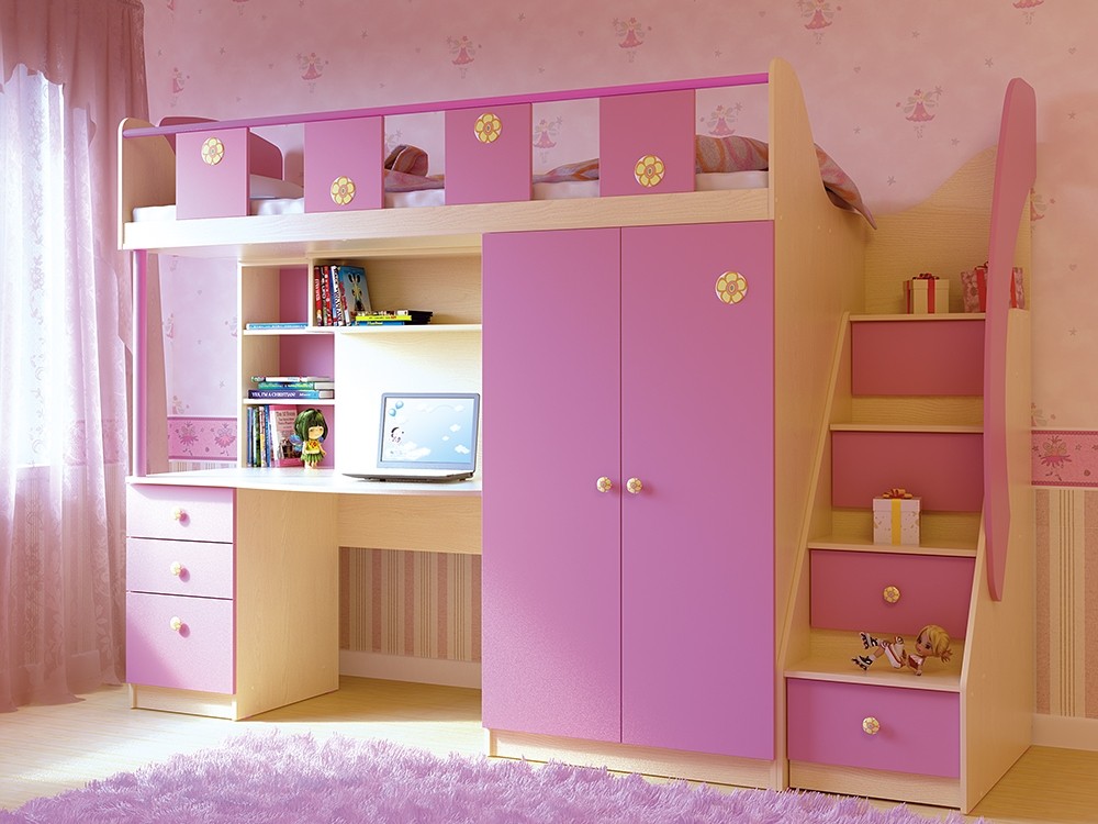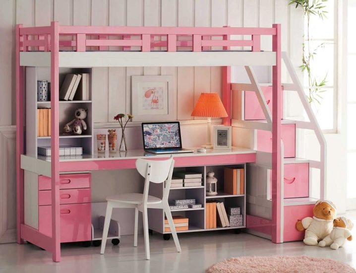 Am beliebtesten sind multifunktionale Modelle. Zum Beispiel zweistufiges Design.Im zweiten "Stock" befindet sich ein Bett für ein Mädchen von 10 Jahren, dessen Größe individuell gewählt wird. Und der "erste" Stock ist ein Arbeitsbereich: ein Schreibtisch für Studien, ein geräumiger Kleiderschrank für Kleidung und Bücher, Regale für Dekorationen und angenehmer Nippes.
