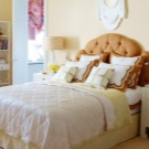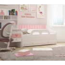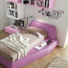 Möbel mit einem weichen Kopfteil sind sehr geeignet für Mädchen - sie ähneln Betten von Märchenprinzessinnen. Neben der ästhetischen Funktion schützt die Polsterung im oberen Teil vor Stößen, da In einem Traum nehmen Kinder manchmal die unglaublichsten Posen. Ein Bett mit einem weichen Rücken wird dem gleichen Zweck dienen. Solch ein Modell ähnelt einem eleganten Sofa und sieht in einem Mädchenzimmer sehr niedlich aus.