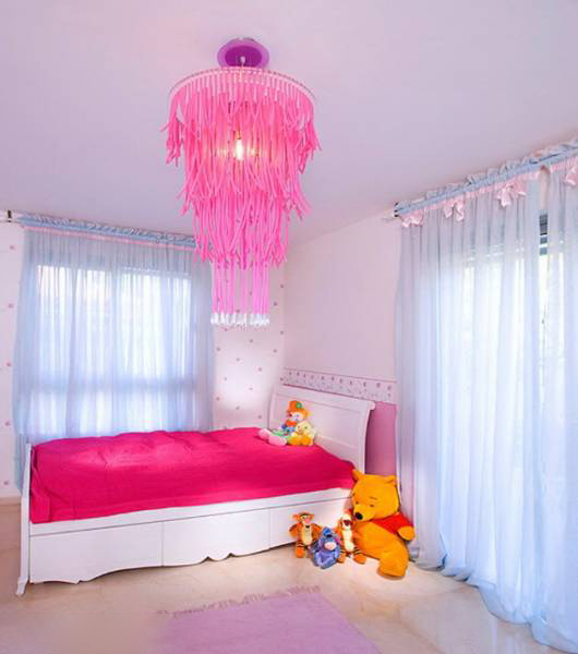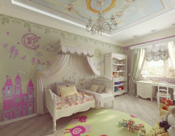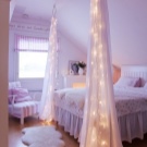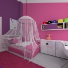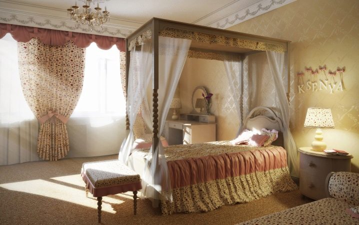 "Königliche Quartiere" für Ihre Tochter können durch den Kauf eines Himmelbettes geschaffen werden.Letzteres kann von zwei Arten sein - auf 4 Stützen an den Ecken des Bettes oder konzentriert in der Mitte über dem Bett (wie oberhalb der Wiege). Sieht sehr feierlich Baldachin mit Lambrequin. Für diese Zwecke ist es besser, dünne durchscheinende Stoffe zu wählen, die leicht zu reinigen sind. Damit das Kind keinen Staub einatmet, muss der Baldachin häufig gewaschen werden.