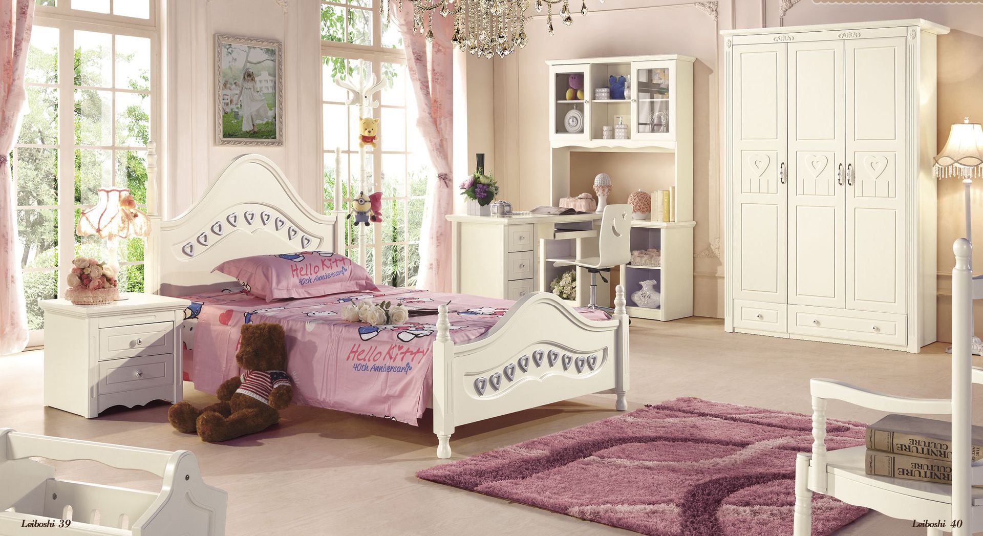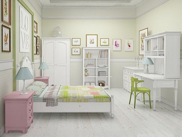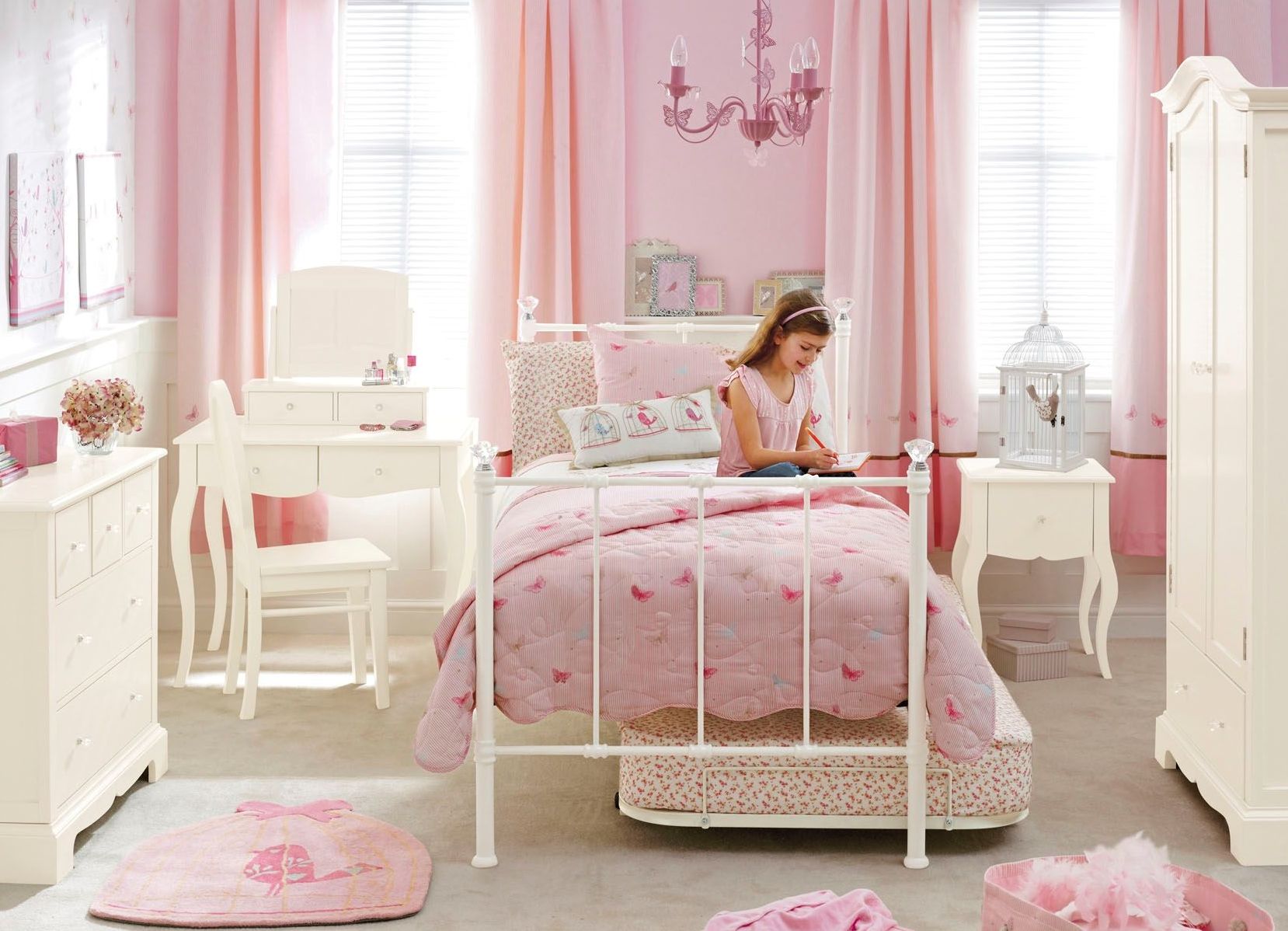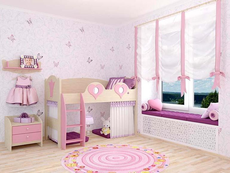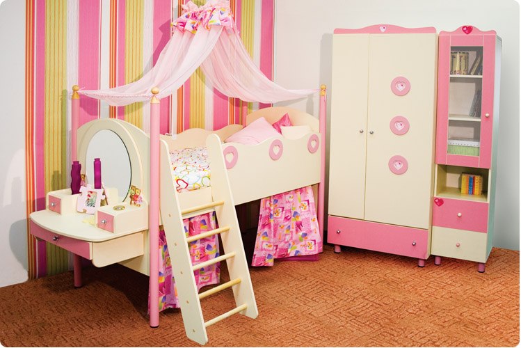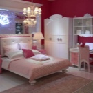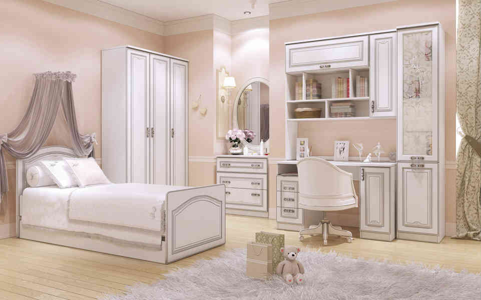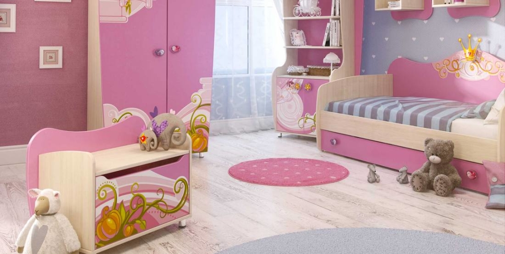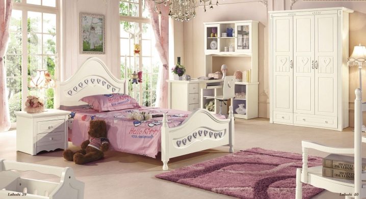 Je nach Alter und Vorlieben des Mädchens können Sie ein solches Set in verschiedenen Farben, Konfigurationen und mit verschiedenen Dekorationen wählen - Bilder, Fräsen usw.