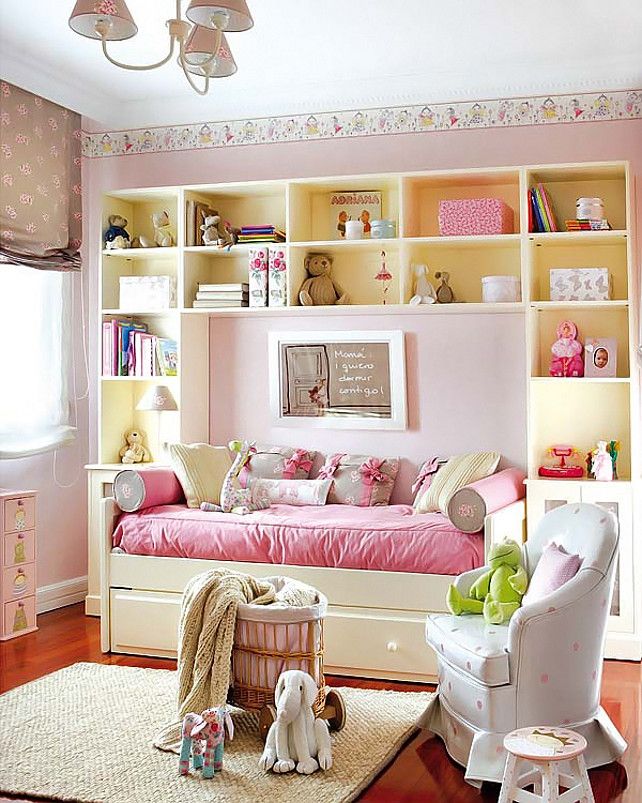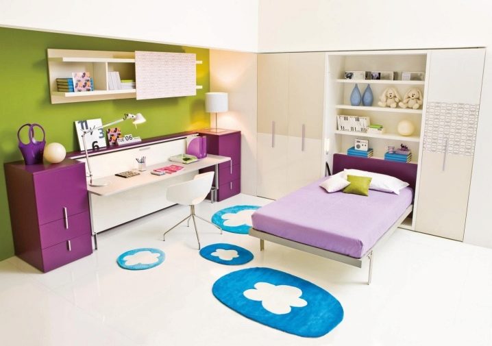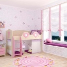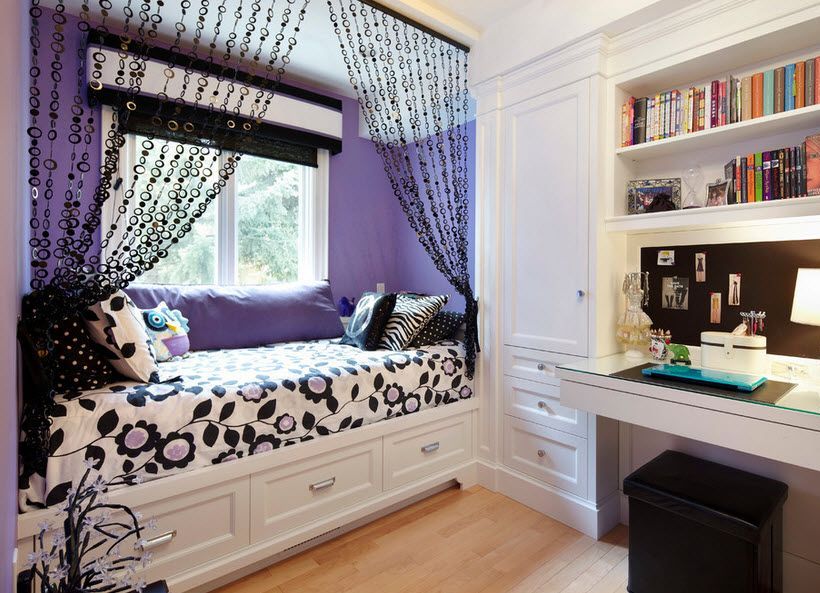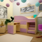 Ecken mit einem Bett und einem Tisch wie Schulmädchen. Das Bett kann sich unten befinden und kann als "Dachboden" - auf der oberen Ebene ausgelegt werden.Um Platz zu sparen, bieten Designer Modelle mit einem Klappbett an. In der Nacht ist sie in einer horizontalen Position, und tagsüber lehnt sie sich (wie ein Regiment in einem Zug), und an ihrer Stelle wird ein Schreibtisch geschoben. Regale mit Schubladen und offenen Regalen nehmen den Raum um das Bett ein. In diesem Bereich können Sie ein System entwerfen und speichern.