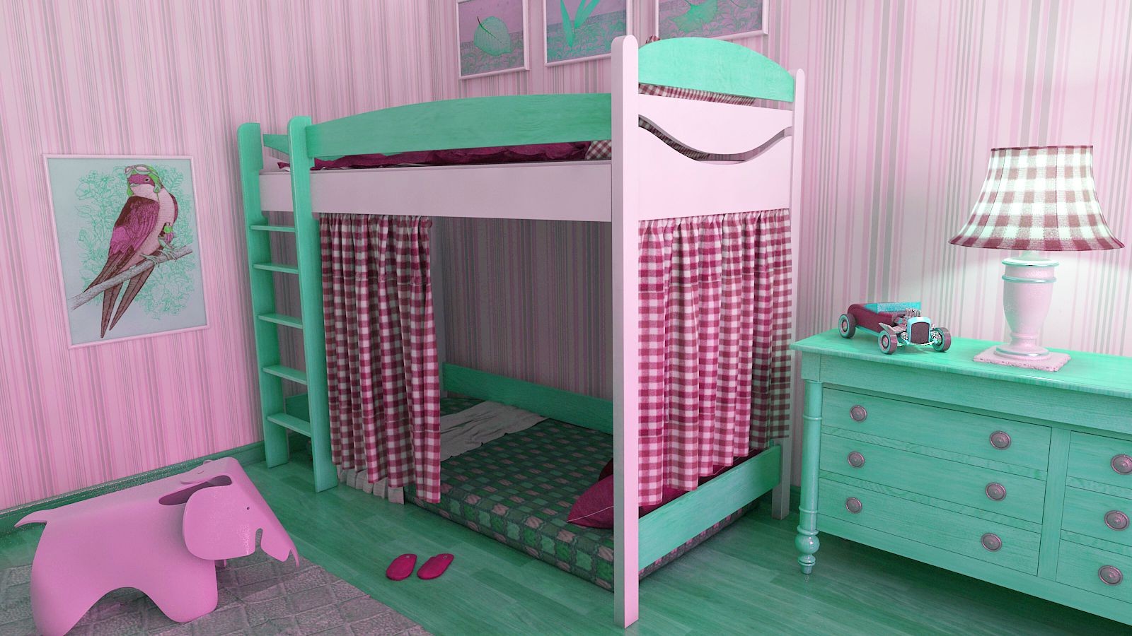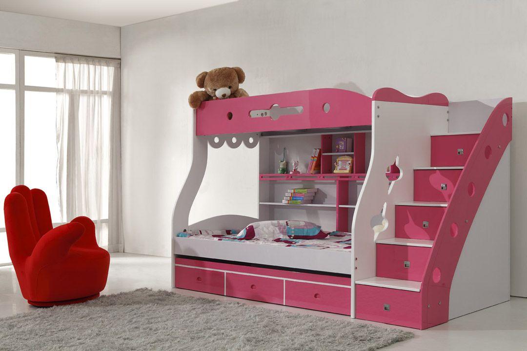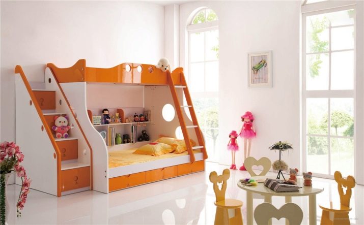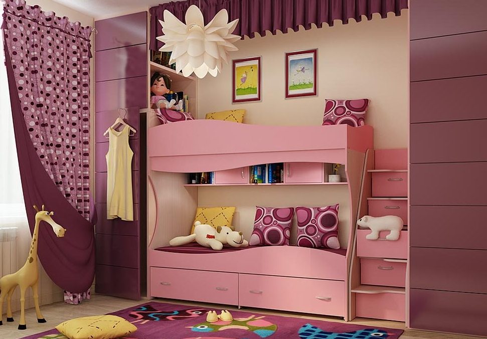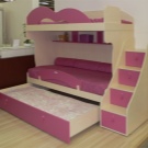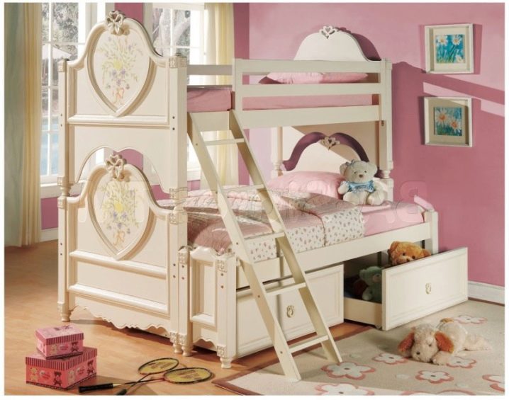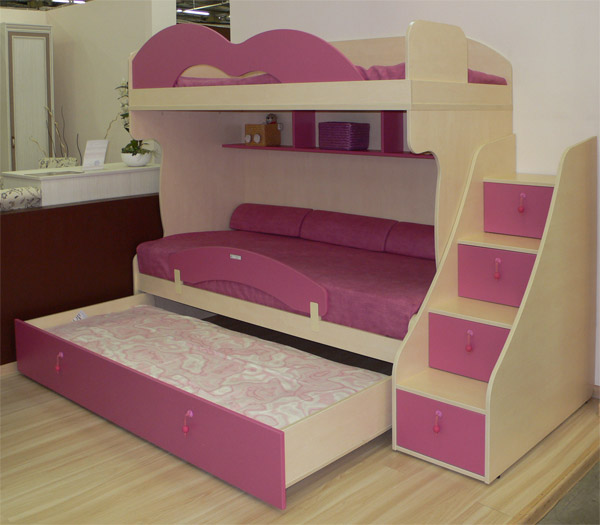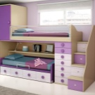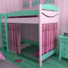 Das einfachste Modell ist ein Bett übereinander. Für Mädchen im schulpflichtigen Alter ist das "intelligente" System perfekt, wenn sich das untere Bett tagsüber nach innen bewegt und an dessen Stelle 2 Klapptische stehen.Auch Betten können relativ zueinander verschoben werden oder sogar in einem Winkel von 90 ° stehen. Die Gestaltung der Treppe kann auch anders sein - die üblichen hinzugefügt, Metall (nach der "schwedischen Mauer" Typ), die Treppe mit breiten Stufen, etc. Aus Sicherheitsgründen wird ein solches Kinder-Doppelbett für Töchter über 5 Jahren empfohlen.