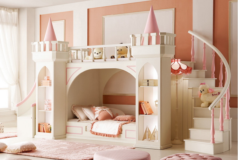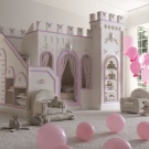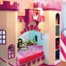 Für Prinzessinnen, die sich unendlich verwöhnen lassen möchten, können Sie ein völlig einzigartiges Bett wählen. Zum Beispiel in Form einer Burg. Diese Lösung wird viel Platz benötigen, aber es wird großartig aussehen. Designer bieten mehrere Möglichkeiten: