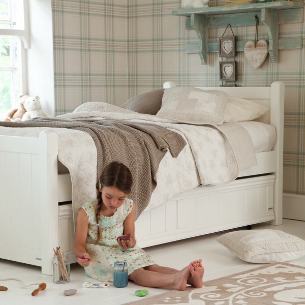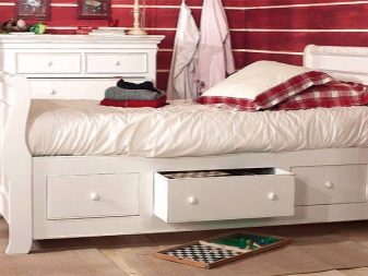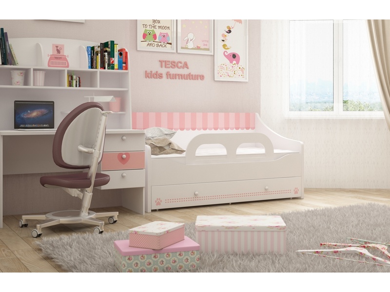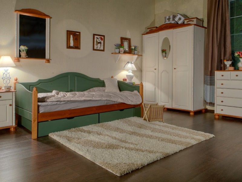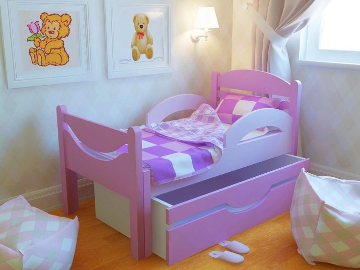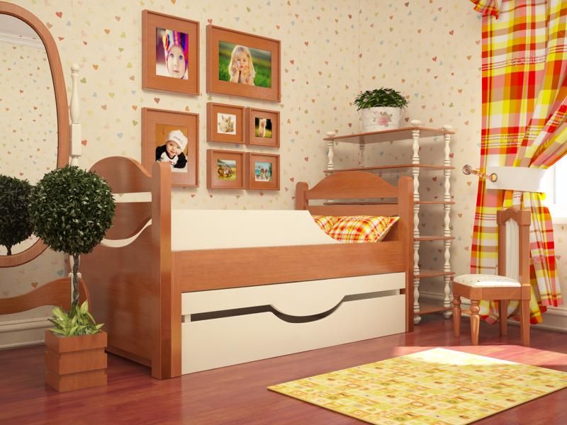 Klassisches Einzel- oder "Halbbett" -Bett für ein Kind ist oft mit Schubladen an der Unterseite ausgestattet. Es ist praktisch für die Lagerung von Bettwäsche oder Babykleidung. Aber es sieht immer ziemlich massiv aus. Das Bett auf den Beinen ohne Schubladen von unten lässt mehr Raum und Luft im Raum.Für ein Mädchen ist diese Option auch gut, weil es zur Aufrechterhaltung der Ordnung anregt, so dass es nichts extra unter dem Bett gibt.