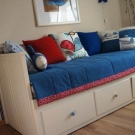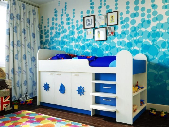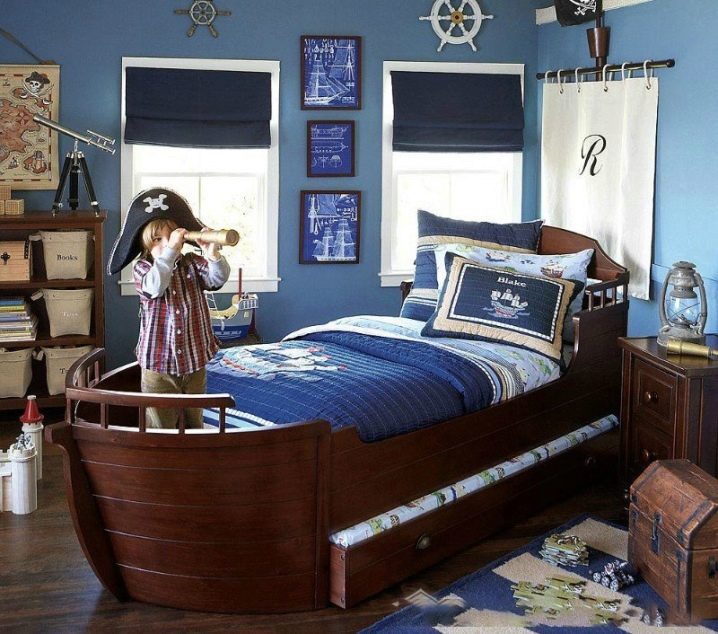 Eine der beliebtesten jungenhaften Optionen.Welcher Junge träumte nicht davon, ein tapferer Kapitän oder ein furchtloser Pirat zu sein? Der maritime Stil in der Gestaltung des Bettes wird durch marine Schattierungen und Muster, sowie originelle Schlafdesigns, in Form eines Schiffs dargestellt, dargestellt.
